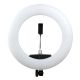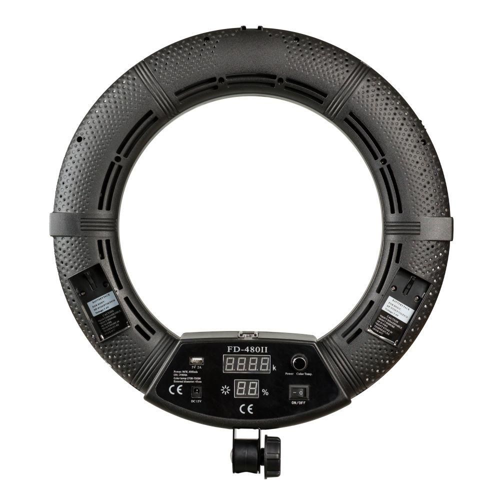 Лампа Fill Light FD-480II — це універсальне рішення для освітлення, яке підходить як для знімання відео, так і для візажу та прямих трансляцій. Поєднання високої яскравості, регулювання колірної температури та зручного кріплення робить її чудовим вибором для професіоналів і аматорів. Особливості та переваги лампи Fill Light FD-480II: • Практична форма кільця з обтічним дифузором і зручно розташованими елементами розширеного функціоналу. • Оптимальні розміри з зовнішнім діаметром 45 см, внутрішнім 35 см і загальною висотою 54 см (разом з кріпленням). • Надійні електронні компоненти та якісно зібраний корпус із комбінації міцного пластику й алюмінієвого сплаву. • Практичне кріплення з шарніром для встановлення на штатив із можливістю настроювання кута нахилу в межах 120°. • Кріплення типу Cold Shoe для встановлення регульованого дзеркала в кільце лампи або тримача для смартфона на гнучкій ніжці, які входять до комплекту. • 480 високоякісних світлодіодів зі збільшеним ресурсом роботи та яскравим, безпечним для очей світлом. • Максимальна потужність 96W, індекс передавання кольору понад 95 Ra, діапазон колірної температури 3200-5500 K і сила світлового потоку 9600 Lm. • Кнопка вмикання, регулятори для настроювання яскравості та колірної температури, а також 2 LED-дисплеї для контролю їхніх показань. • Роз'єм USB для заряджання смартфона, 2 слоти для знімних батарей NP-F (не входять до комплекту) і роз'єму DC для під'єднання комплектного мережевого блока живлення. • Міцний телескопічний штатив із триногою, який має практичну складану конструкцію з мінімальною висотою 49 см і максимальний — 231 см (разом із лампою). • Практична сумка розмірами 54×53×9 см для безпечного зберігання лампи та її зручного транспортування. Fill Light FD-480II — не просто освітлювальний прилад, а інструмент, який допоможе розкрити творчий потенціал і реалізувати найкреативніші ідеї. Незалежно від формату роботи — запис відео, фото, макіяж або трансляції — ця лампа забезпечить професійне освітлення для будь-яких завдань у будь-яких умовах.