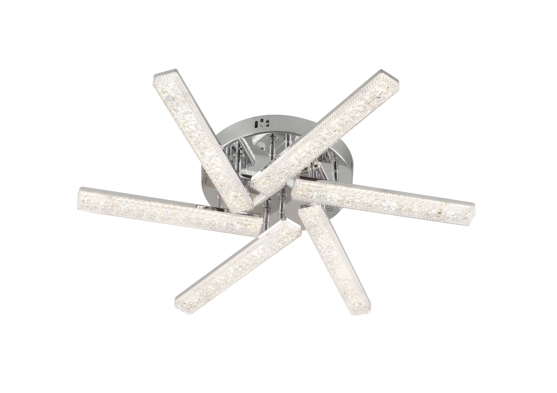 Ця люстра виготовлена з високоякісного акрилу та має шість елегантних плафонів прямокутні хромового кольору. Її дизайн виразно демонструє сучасність та елегантність, розміри люстри - 640 мм довжина, 640 мм ширина і 90 мм висота.