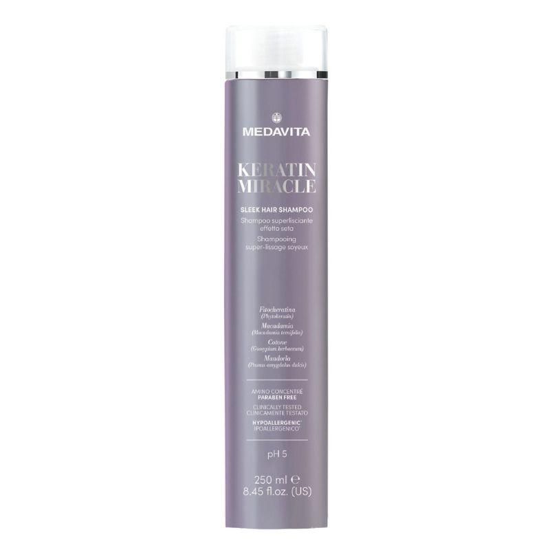 Medavita Keratin Miracle Sleek Shampoo — розгладжувальний шампунь з ефектом шовку для неслухняного, пухнастого та кучерявого волосся; забезпечує делікатне очищення з pH 5, проникаючи в структуру для відновлення та заповнення ушкоджень, підходить для всіх типів, включно з ослабленими після хімічних процедур, мінімізує пухнастість, надає блиску й еластичності без парабенів і сульфатів.