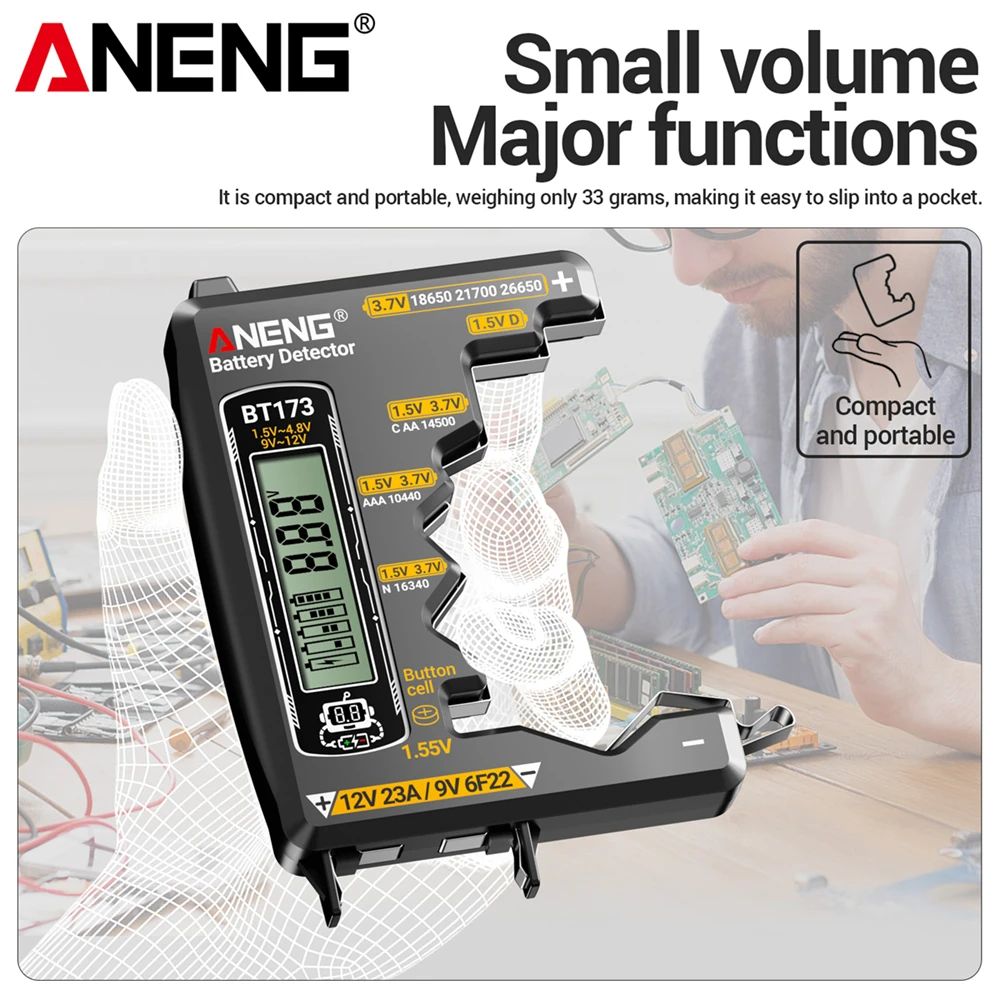 - Тестер ANENG BT173 призначений для оперативної перевірки стану батарейок або акумуляторів у побутових та професійних пристроях.