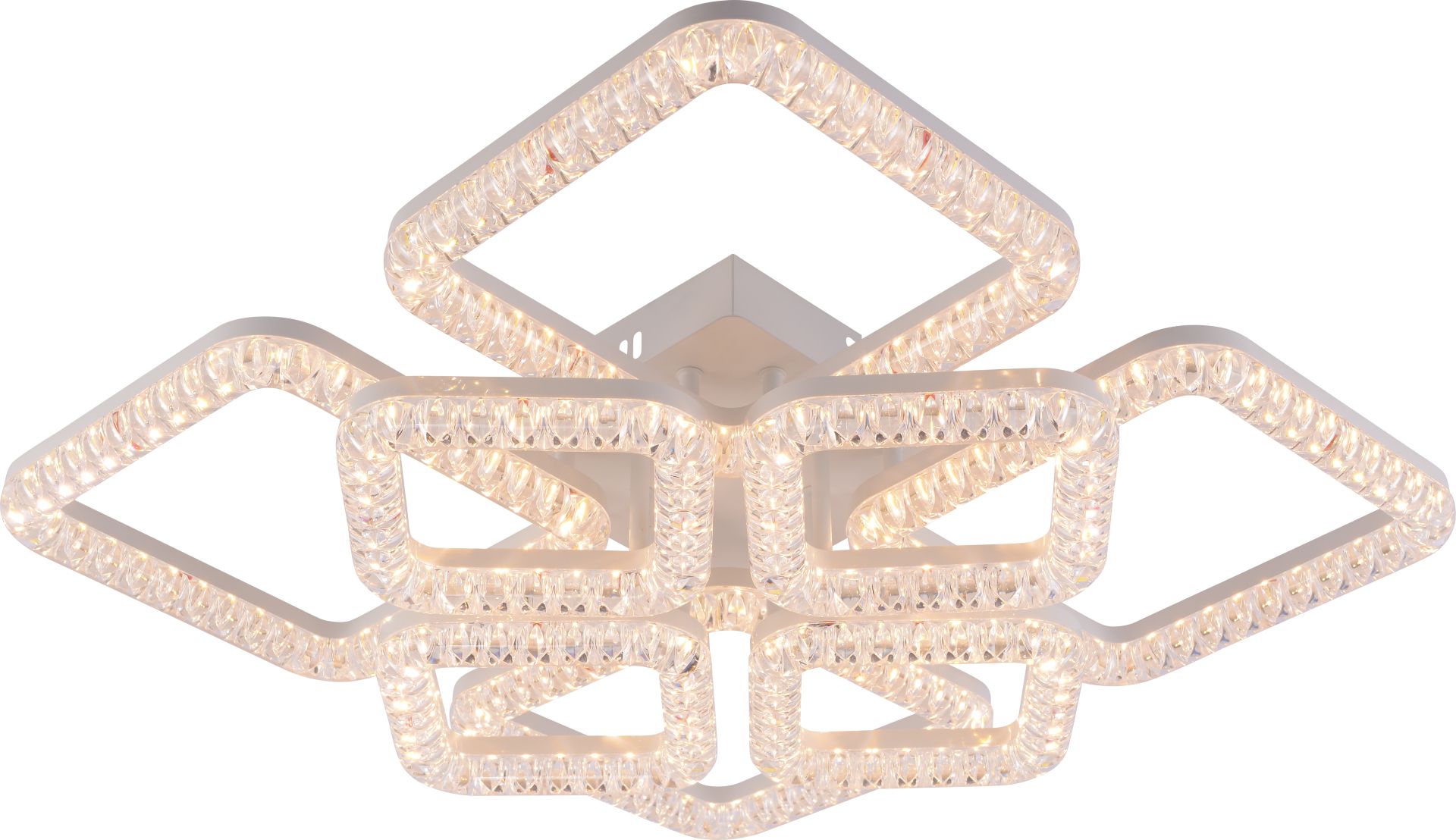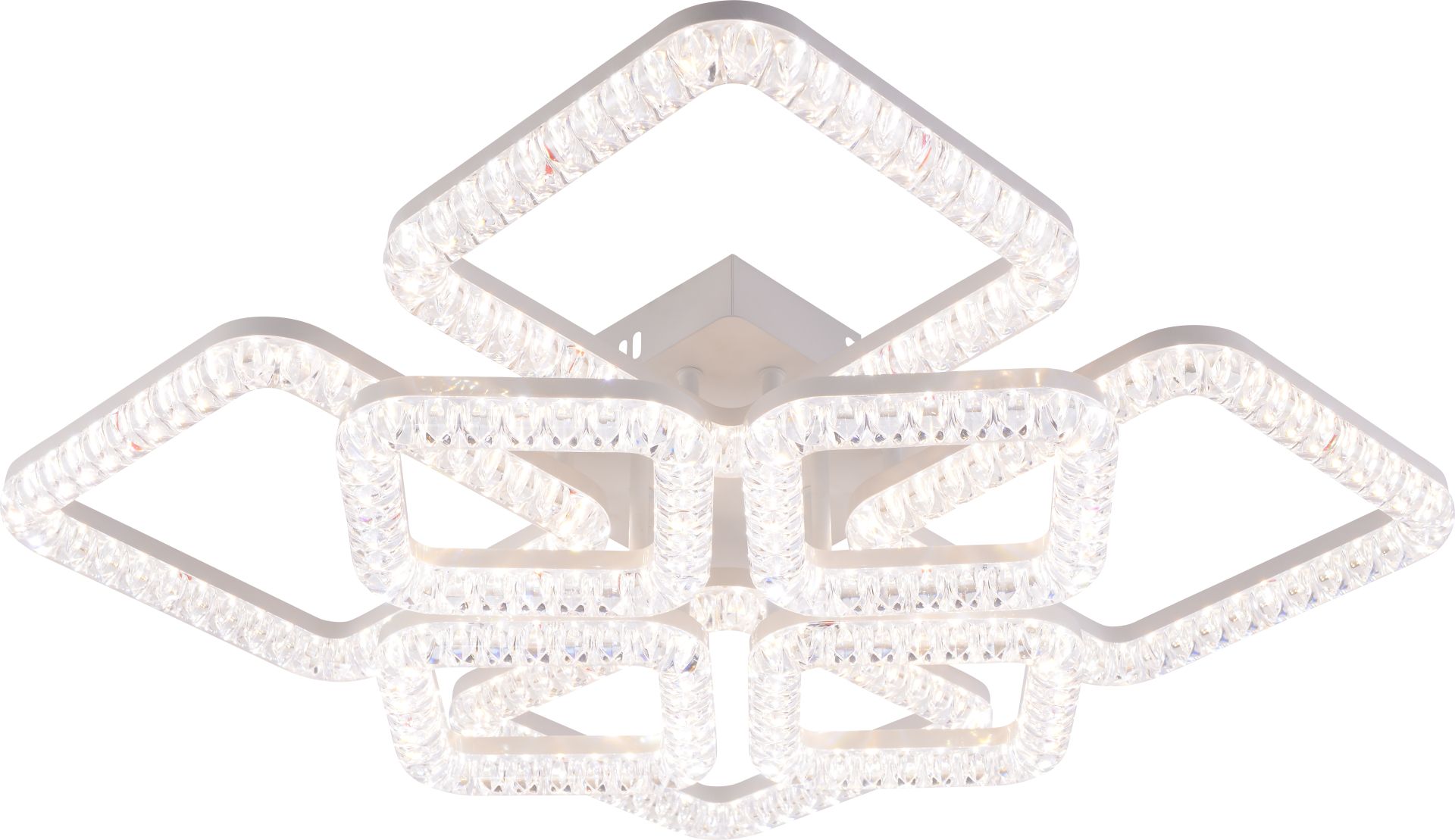 Люстра оснащена вісьмома джерелами світла у формі квадратів, у кожному з яких інтегрована високоякісна світлодіодна стрічка. Така конструкція створює ефектний об’ємний вигляд і забезпечує рівномірний розподіл світла по всій кімнаті. Загальна потужність 115 Вт і світловий потік 11520 лм гарантують потужне, насичене освітлення, якого достатньо навіть для великих приміщень — віталень, залів, офісів або просторих спалень.