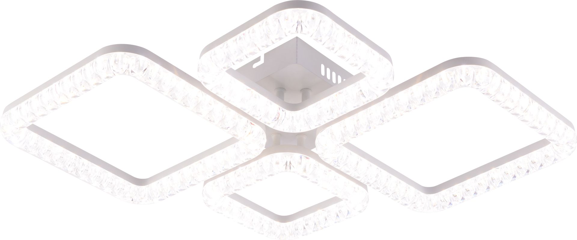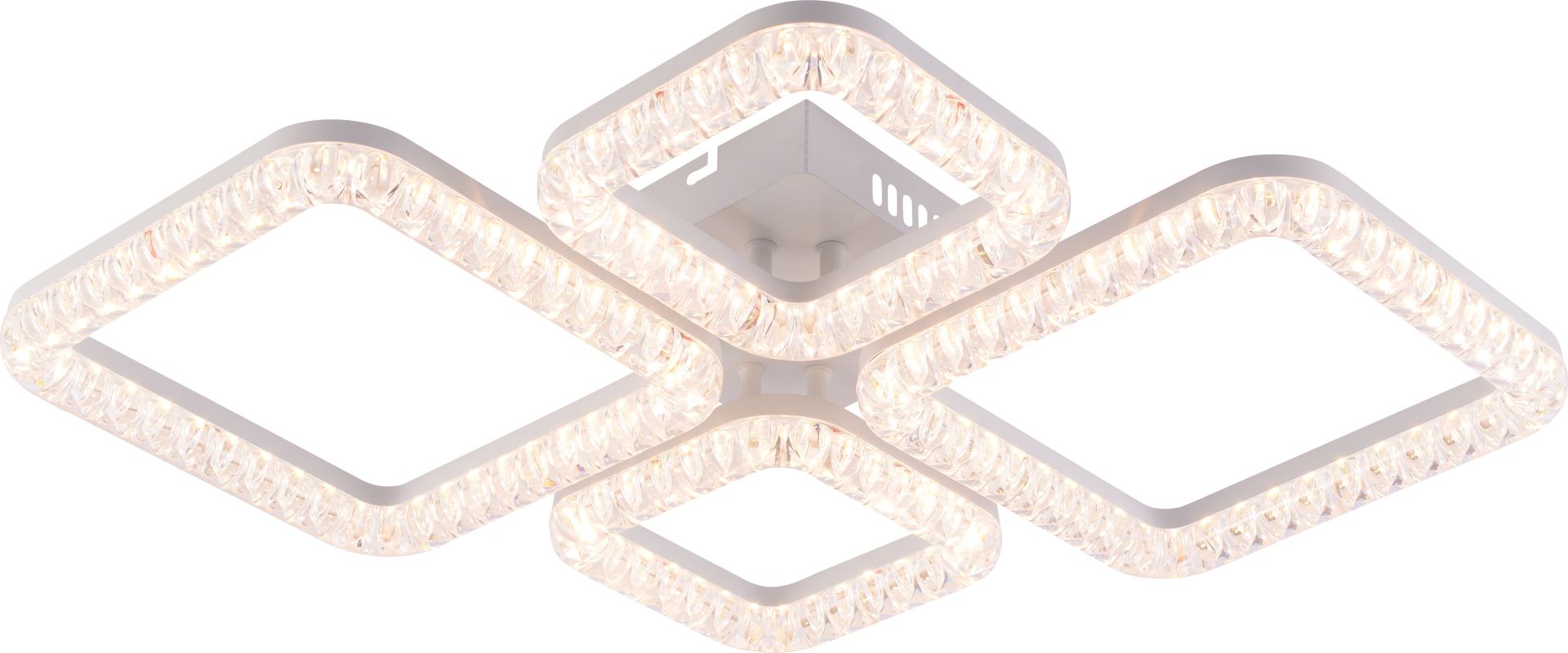 Люстра оснащена чотирма джерелами світла у формі квадратів з вбудованою світлодіодною стрічкою, яка рівномірно розсіює світло, створюючи комфортне освітлення без різких відблисків. Завдяки потужності 58 Вт і світловому потоку 5760 лм, модель забезпечує достатню яскравість навіть для просторих кімнат, водночас залишаючись енергоощадною.