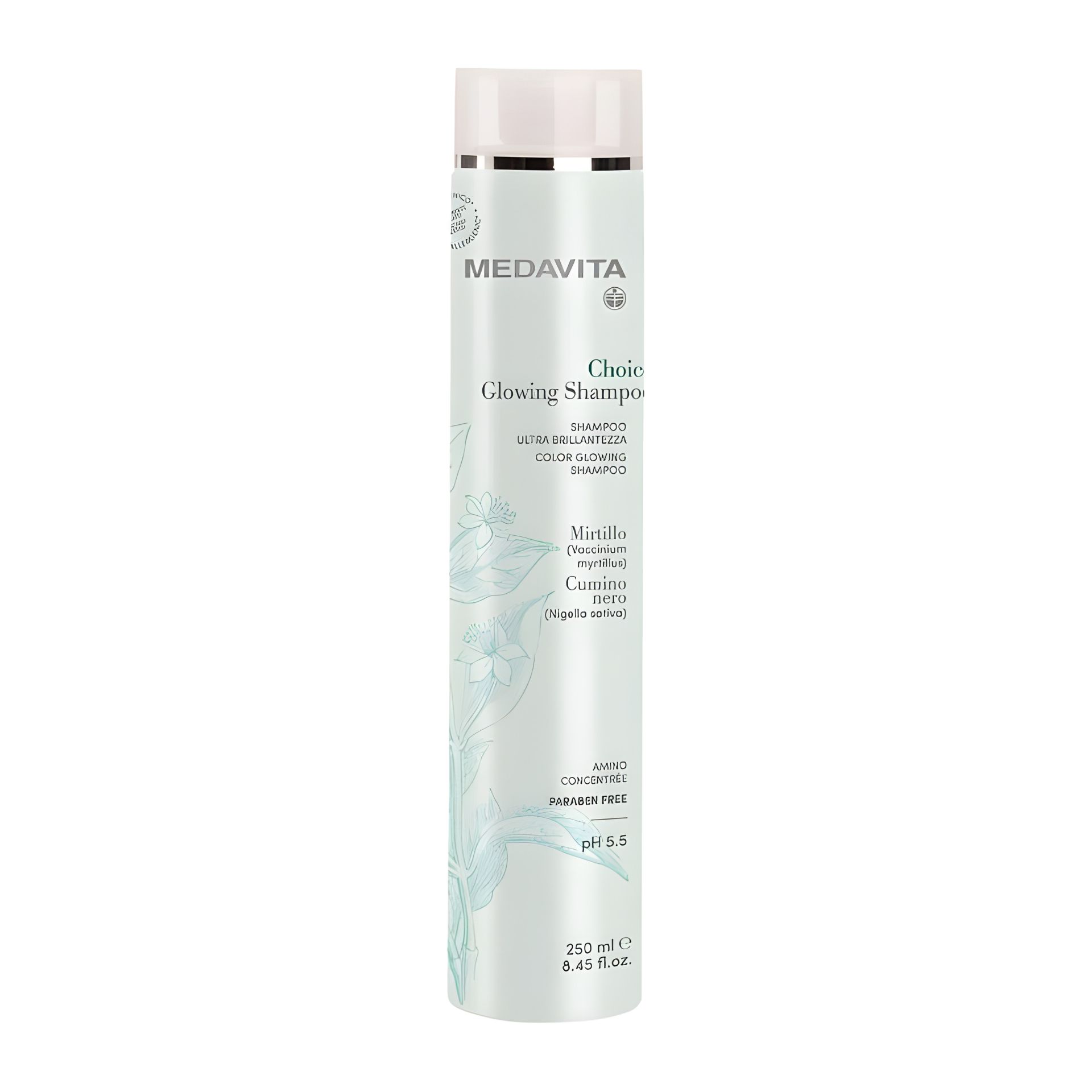 Medavita Choice Glowing Shampoo — антиоксидантний шампунь для фарбованого, освітленого та натурального волосся, що забезпечує м'яке очищення з pH 5.5 без вимивання пігменту; проникає в структуру для живлення та захисту кольору, підходить для всіх типів, включно з сухими й ослабленими, надає дзеркальний блиск і еластичність без парабенів і сульфатів.