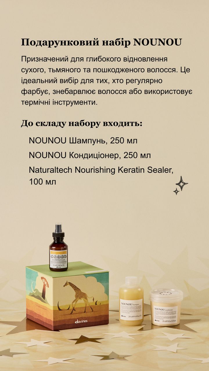 Подарунковий набір Davines NOUNOU Box 2025 призначений для комплексного відновлення сильно пошкодженого, сухого та ламкого волосся після фарбування, хімічної обробки або агресивних процедур; шампунь м'яко очищає й живить, кондиціонер підсилює регенерацію, спрей запечатує кутикулу та захищає від термічного пошкодження, підходить для всіх типів пошкодженого волосся, запобігає подальшій ламкості та зневодненню без парабенів і сульфатів.