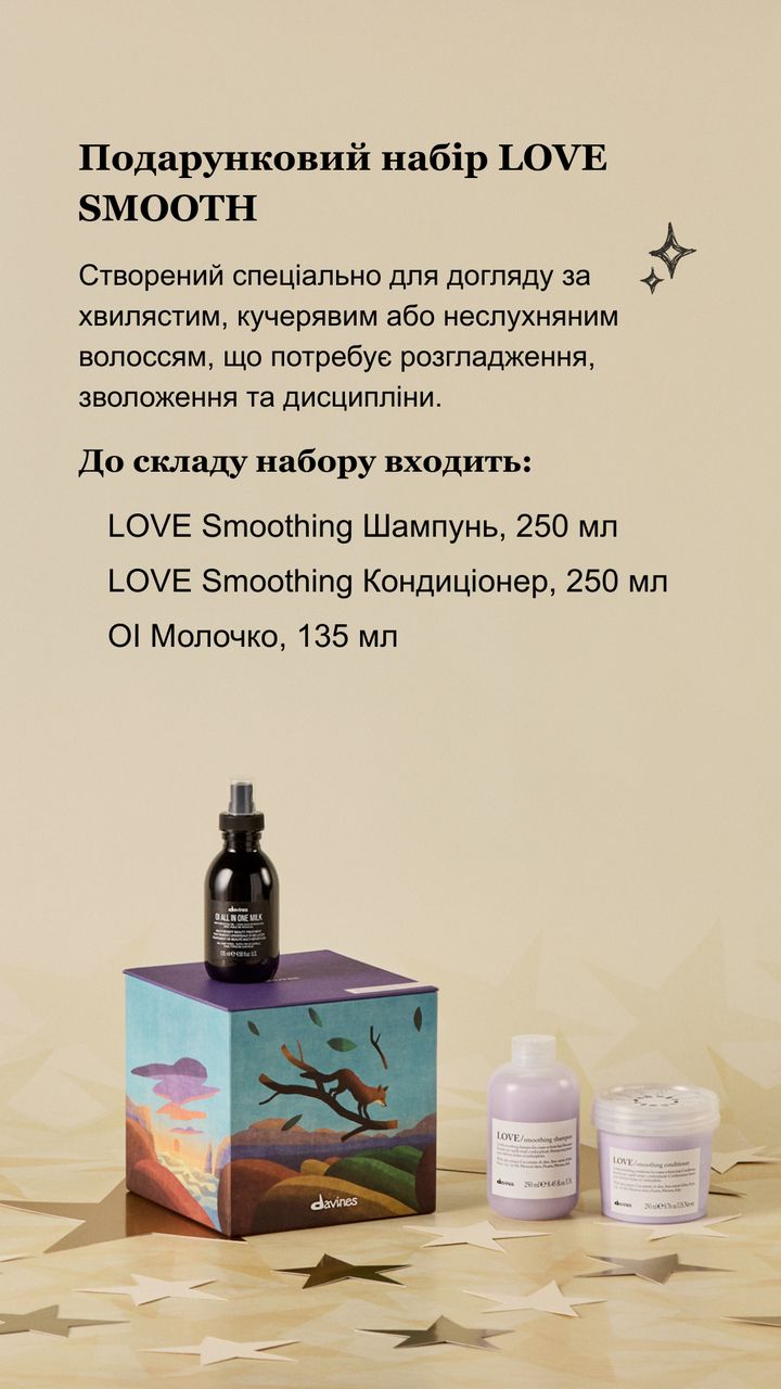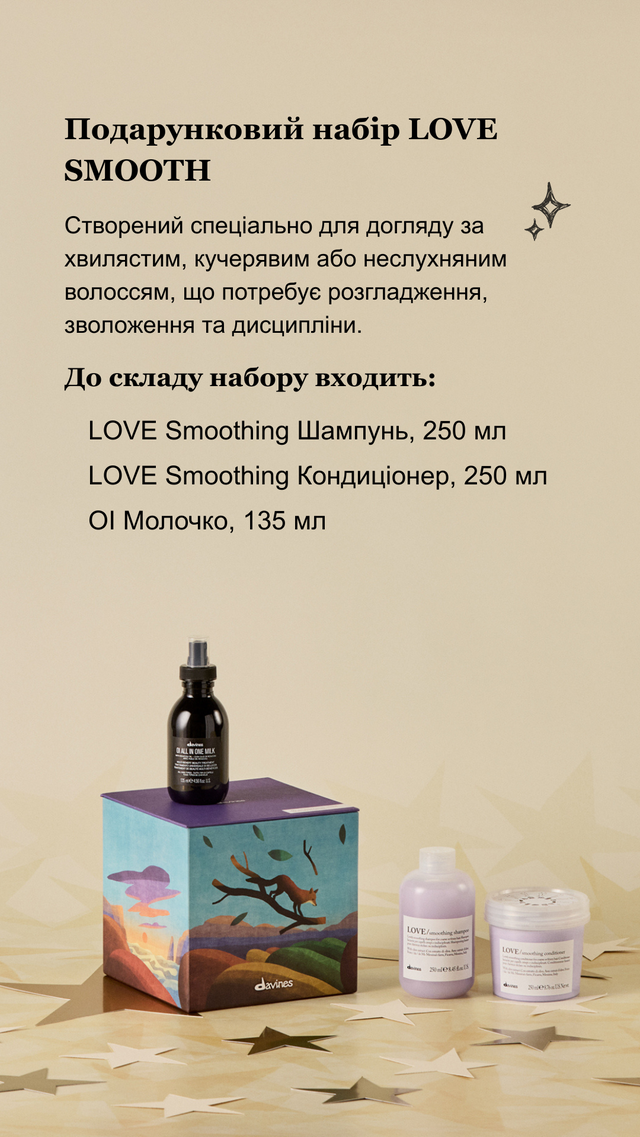 Подарунковий набір Davines LOVE Smooth Box 2025 призначений для комплексного розгладження неслухняного, кучерявого та пухнастого волосся, забезпечуючи м'яке очищення, зволоження та контроль текстури; шампунь м'яко очищає без обважнення, кондиціонер живить і вирівнює структуру, молочко захищає від тепла та зовнішніх чинників, підходить для всіх типів неслухняного волосся, включно з сухим і пошкодженим, запобігає пухнастості та ламкості без парабенів і сульфатів.