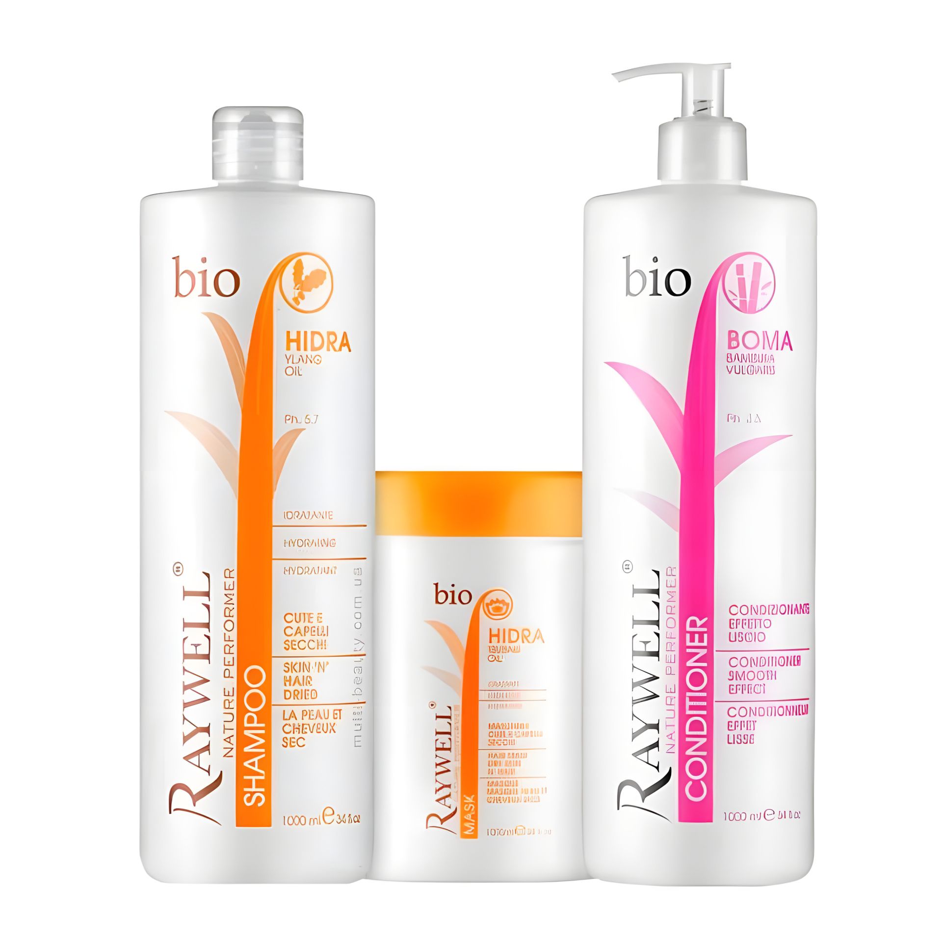 Набір для зволоження і блиску сухого пошкодженого волосся Raywell Bio: шампунь, маска Hidra і кондиціонер Boma, 3x1000 мл