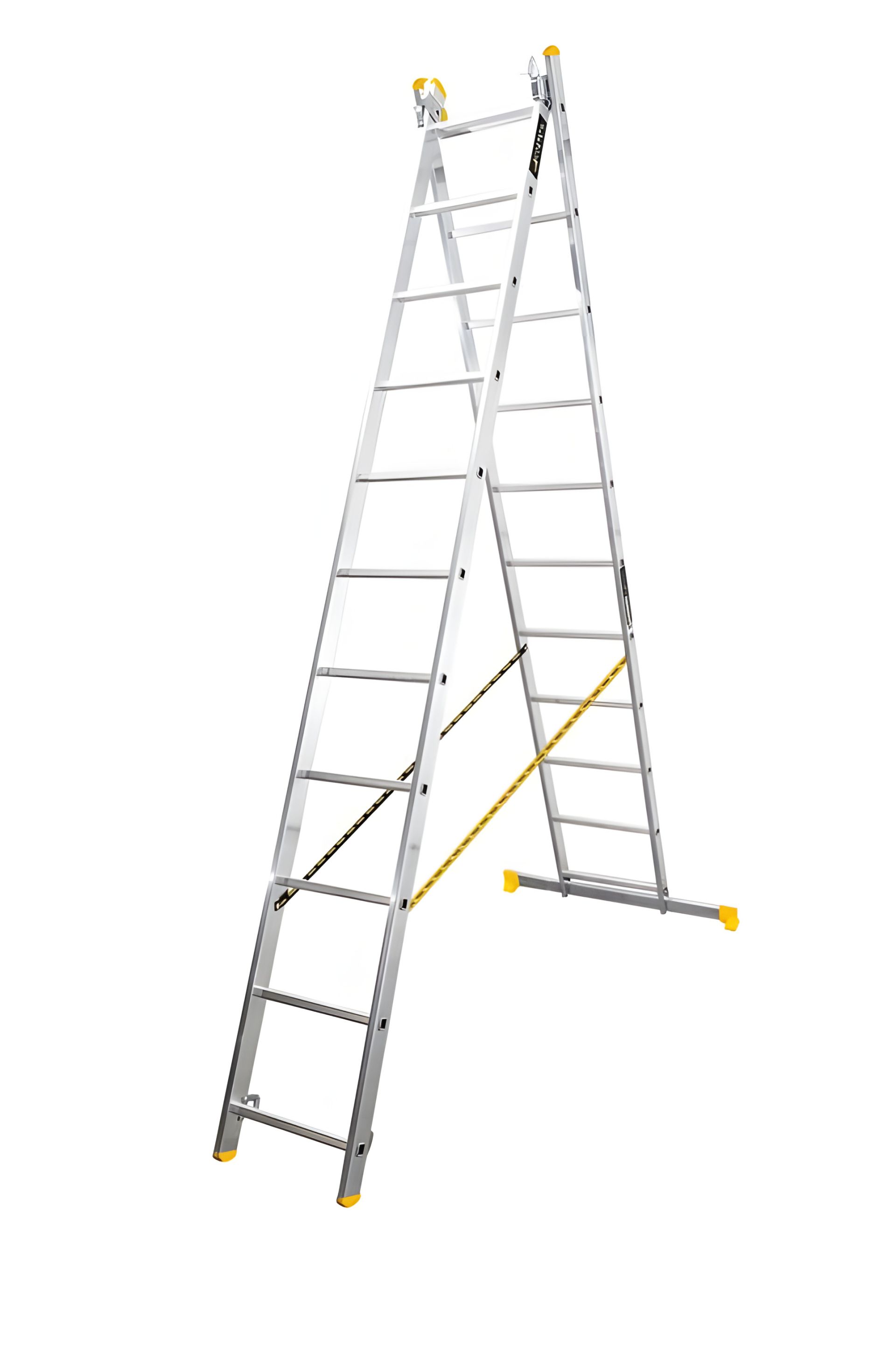 Алюмінієві двосекційні сходи 2х11 ступенів — це універсальна та функціональна модель, яка дозволяє працювати на висоті до 5,33 м. Завдяки комбінованій конструкції, сходи можна використовувати як драбину або приставну, що забезпечує гнучкість та зручність у будь-яких умовах.