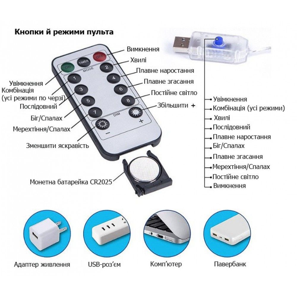 - Пульт дозволяє змінювати ефекти одним натисканням кнопки, плавно зменшувати або збільшувати яскравість і вмикати таймер, щоб гірлянда сама вимикалася вночі і вмикалася ввечері, заощаджуючи енергію та продовжуючи термін служби.