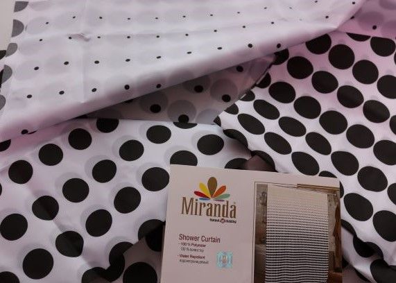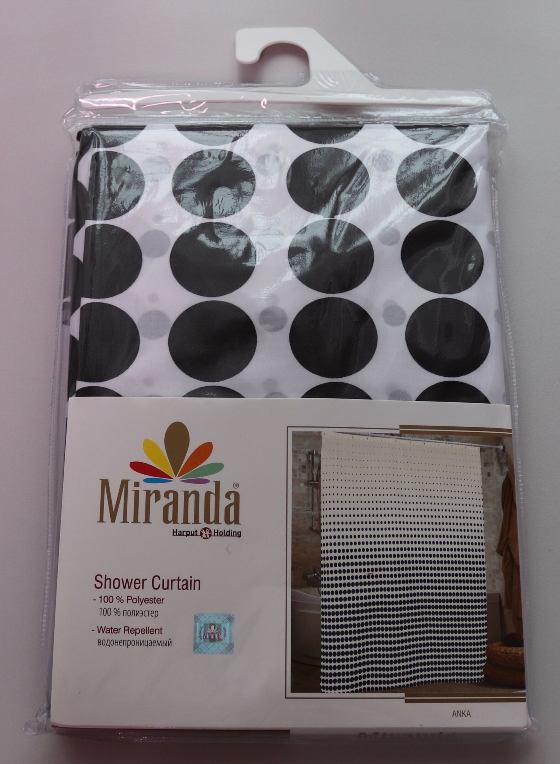 Штора для ванної та душа Miranda виробництва Туреччини. Склад 100% поліестер (тканина з водовідштовхувальним просоченням). Відмінна якість, не втрачає свого первісного вигляду навіть після багаторазового прання. Отвори під кільця оброблені пластиком. Кілець в комплекті немає, їх можна придбати додатково.