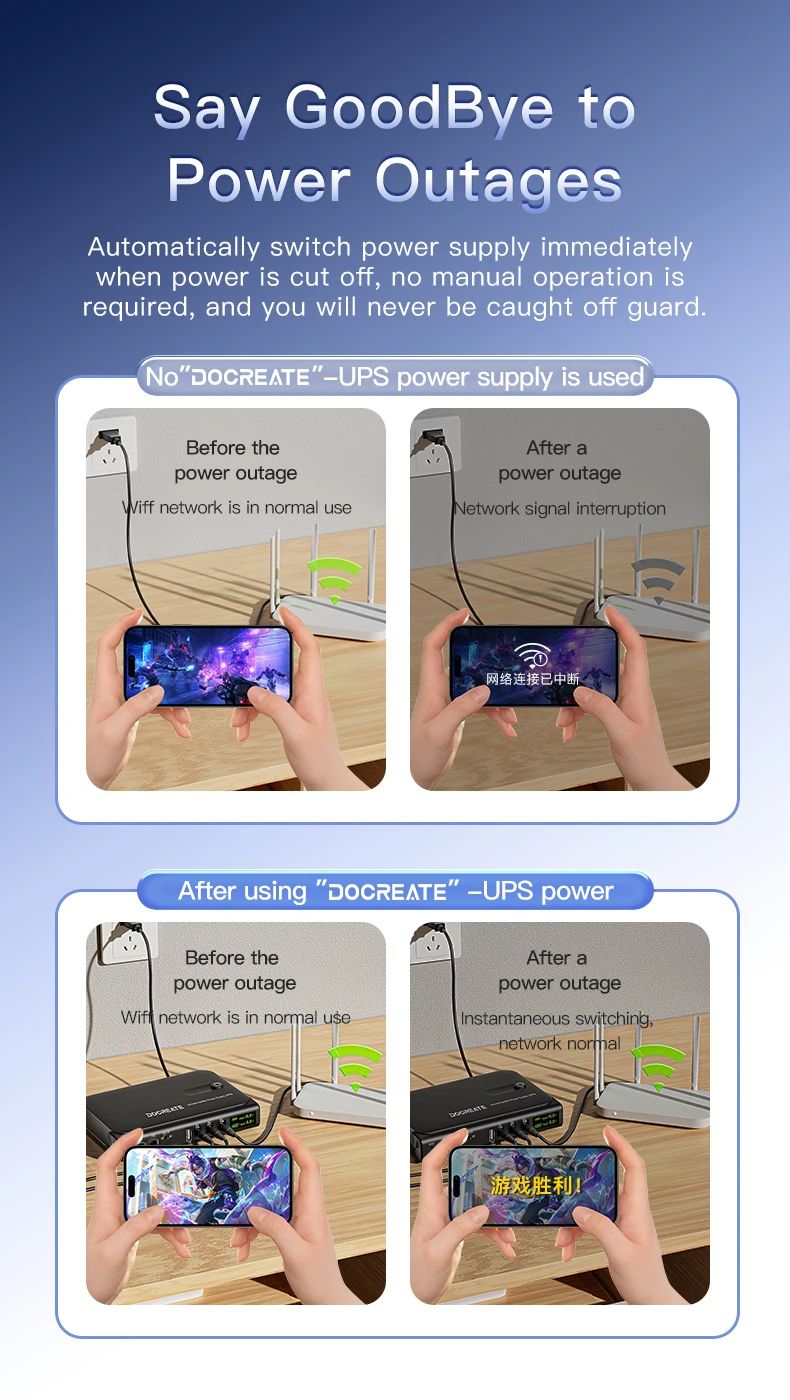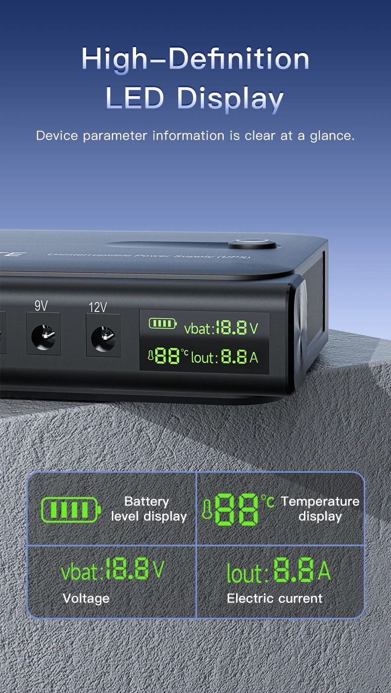 Doocreate DC1036L — це компактний лінійно-інтерактивний DC-UPS для живлення роутера, оптичного модему, камер відеоспостереження, свитчів, NAS та інших малопотужних пристроїв при перебоях електромережі. При зникненні напруги мережа/Інтернет продовжують працювати без перезавантаження та обривів зв'язку, а після відновлення живлення ДБЖ автоматично повертається у звичайний режим. Пристрій використовує 4 змінні акумулятори 18650 (купуються окремо) та оснащений інформативним LED-дисплеєм, що показує напругу, струм, температуру та рівень заряду.