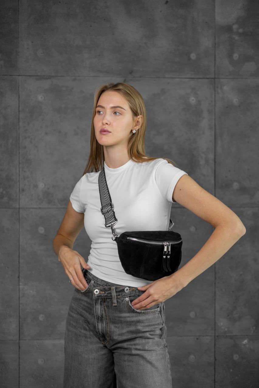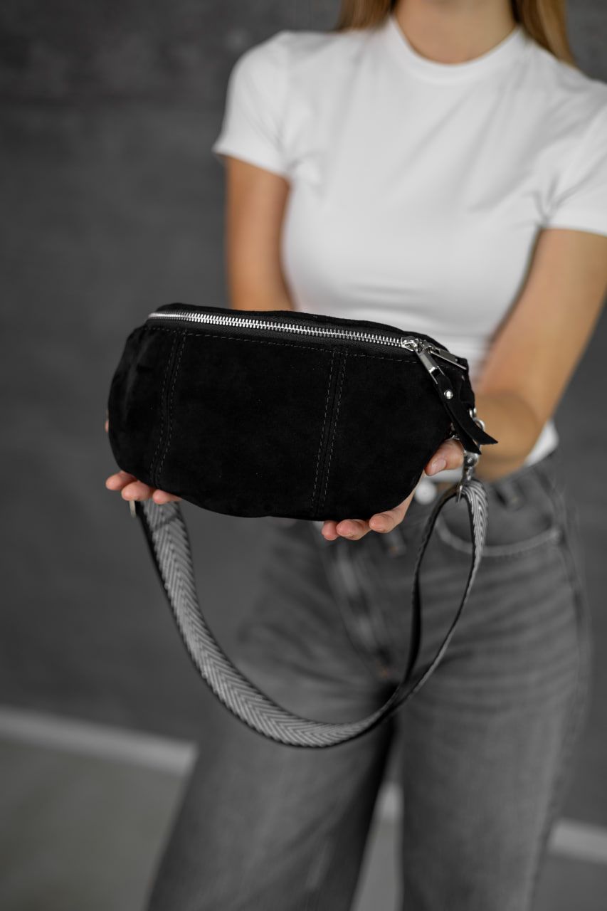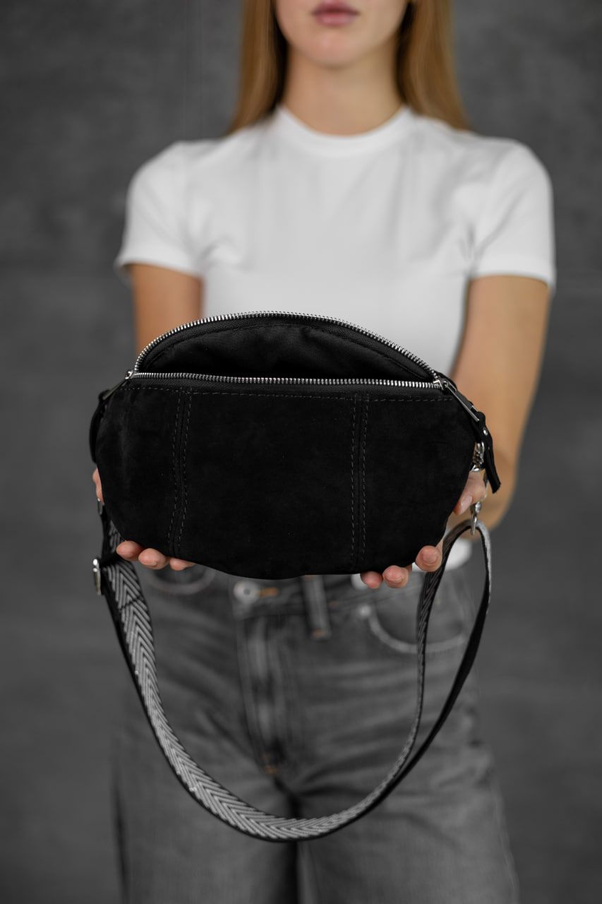 Жіноча бананка з чорної замші — це стильний і зручний аксесуар, що поєднує в собі елегантність і практичність. Виготовлена зі 100% натуральної замші, вона має м’яку, приємну на дотик текстуру та матове, глибоко чорне покриття, яке додає образу витонченості.
