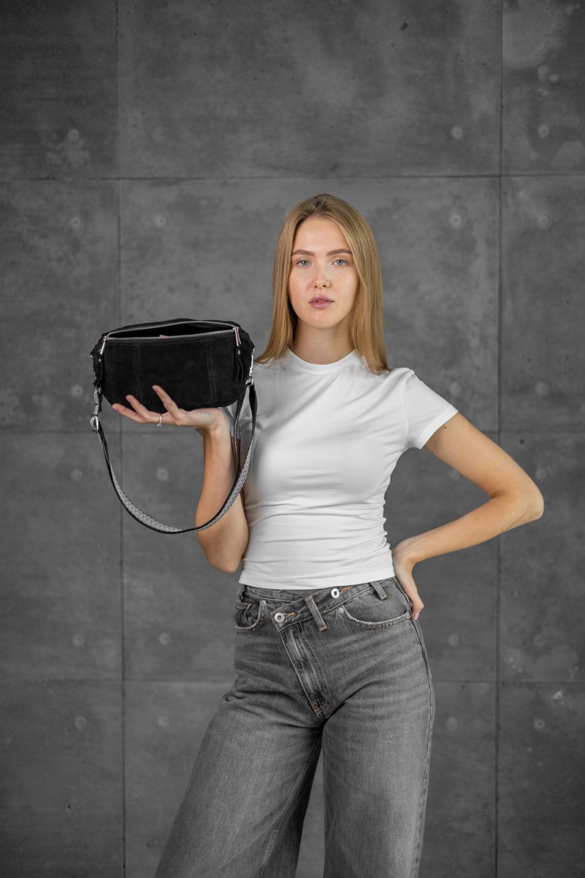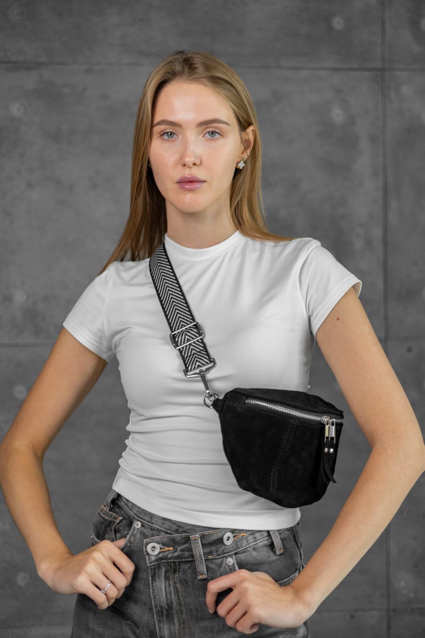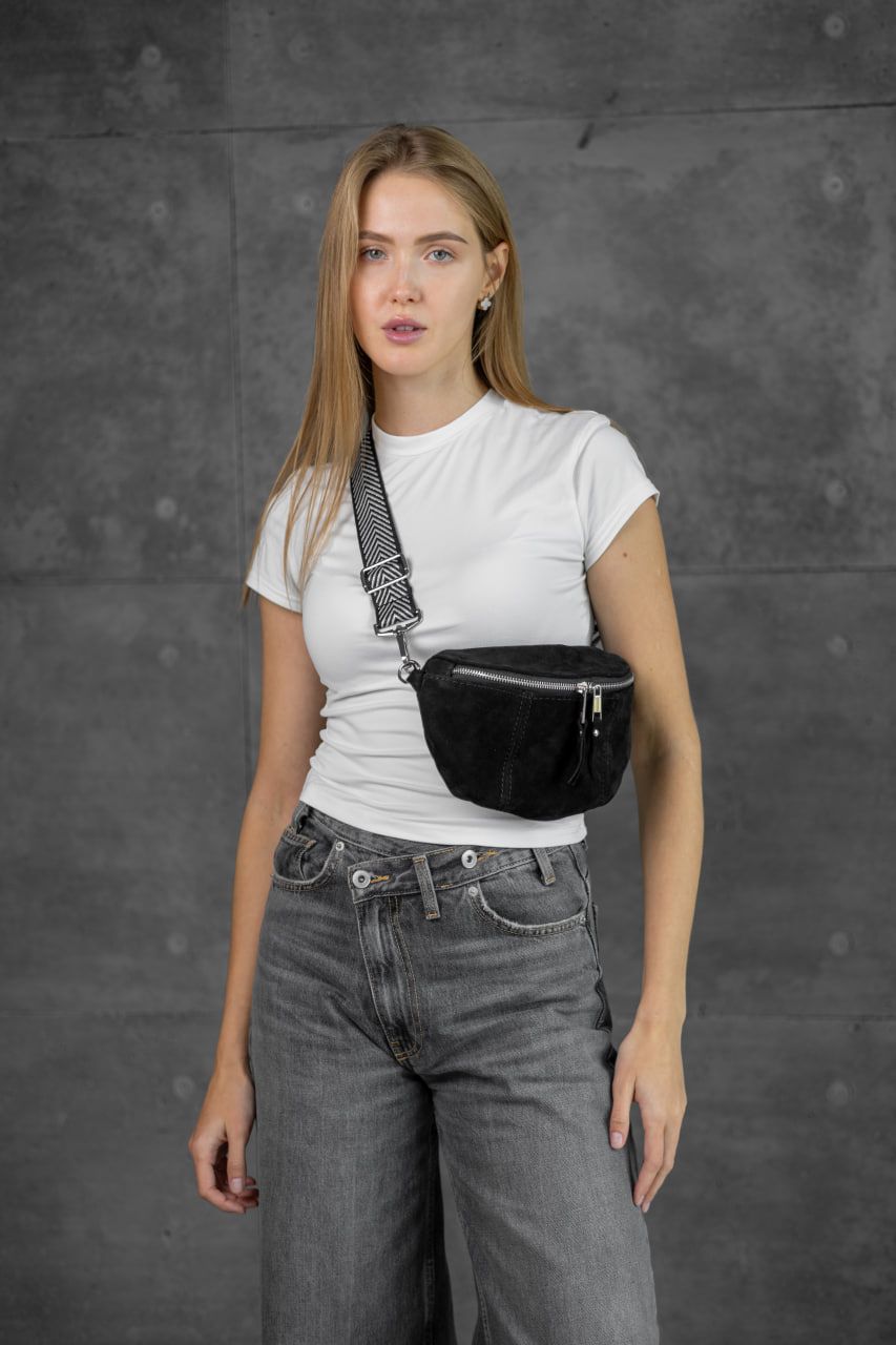 Жіноча бананка з чорної замші — це стильний і зручний аксесуар, що поєднує в собі елегантність і практичність. Виготовлена зі 100% натуральної замші, вона має м’яку, приємну на дотик текстуру та матове, глибоко чорне покриття, яке додає образу витонченості.
