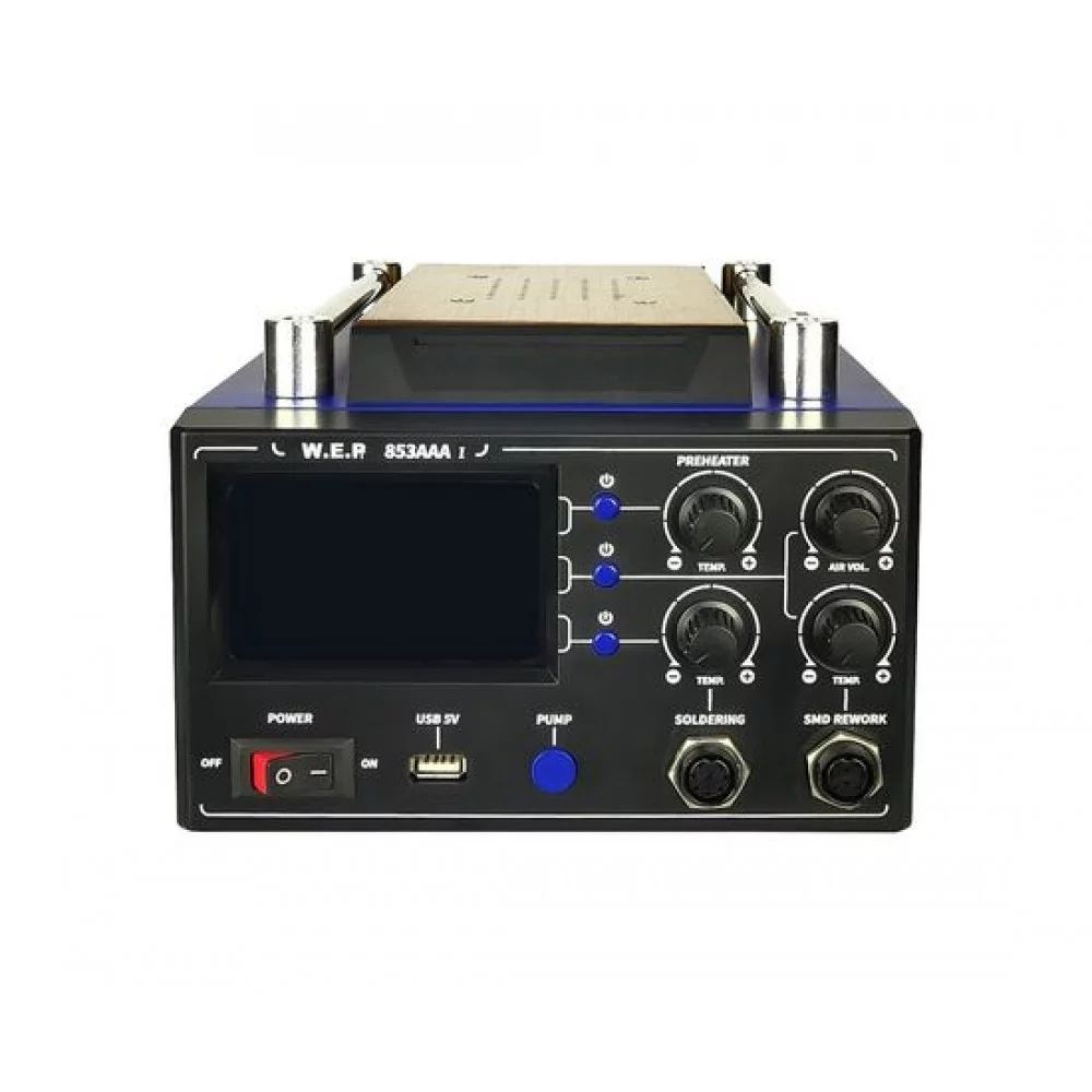 Паяльна станція WEP 853AAA-I з вбудованим вакуумним сепаратором 9" (20 × 11 см), феном і паяльником - це багатофункціональний комплекс "3-в-1" для професійного ремонту електроніки. В одному корпусі об'єднані інфрачервоний підігрівач/сепаратор для дисплейних модулів, SMD-компонентів та класичний паяльник для точного контактного паяння Додатково передбачений USB-порт 5 V для живлення та зарядки невеликих пристроїв.