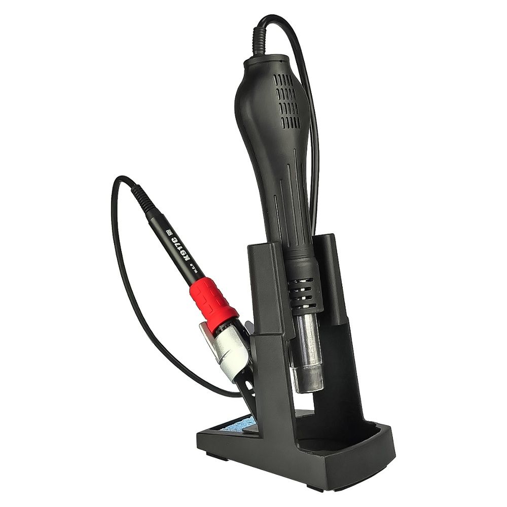 - Окремі регулятори температури та потоку повітря дозволяють підібрати оптимальні параметри для будь-яких завдань: демонтаж/монтаж QFP, BGA, SOIC, QFN, конекторів, пайка шлейфів, усадка термотрубок та ін. Можливість роботи з малим потоком повітря допомагає не здувати дрібні компоненти.