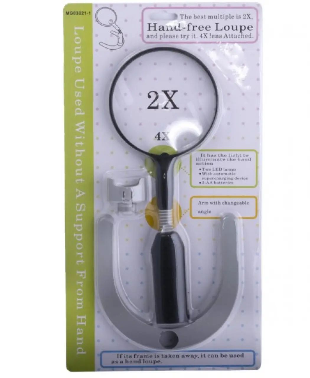- Без підставки — повноцінна ручна лупа для мобільного використання.