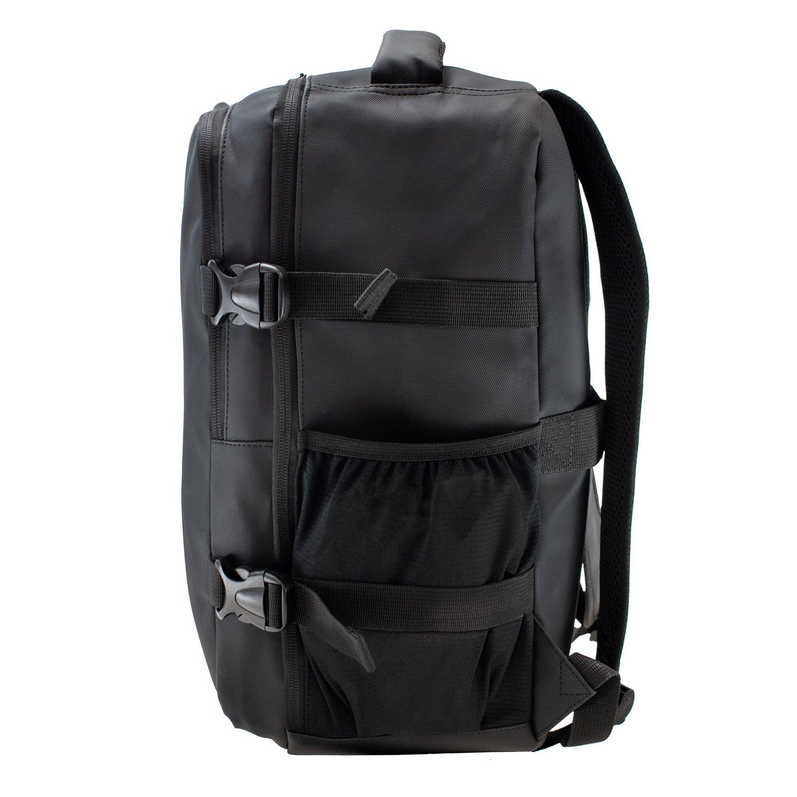 На фронтальній частині розташована велика плоска кишеня на блискавці, яка підійде для документів формату A4 та менша вертикальна кишеня з відбивним елементом на замку. З обох боків є сітчасті кишені з еластичною стрічкою по краям, які зручно використовувати для пляшки чи парасольки. Для комфорту рюкзак має ущільнені спинку та лямки, що зменшують навантаження під час носіння. На задній частині передбачено стрічку для кріплення на телескопічну ручку валізи, а також компресійні ремені, які допомагають утримувати форму та зменшувати об’єм при транспортуванні.