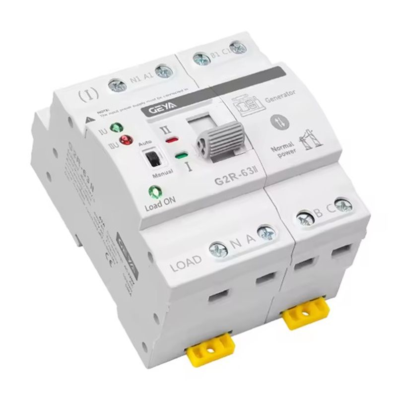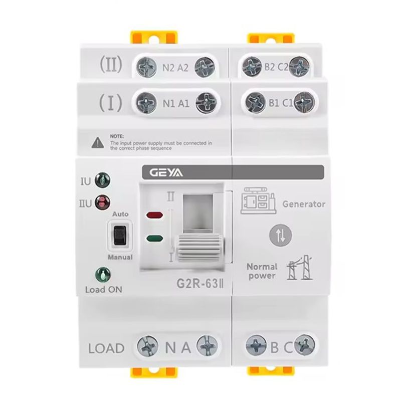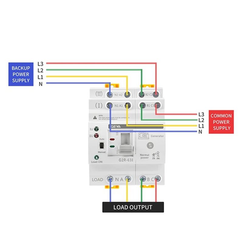 Автомат введення резерву (АВР) GEYA G2R-63 4P 63А - 4х полюсний (3 фази + нуль) - це автоматичний перемикаючий пристрій між основною мережею електроживлення та резервною (інвертор, генератор, ecoflow і т.д.). Це компактний автомат введення резерву, шириною 8,3 см, займає 5 модулів та монтується на стандартну DIN рейку.