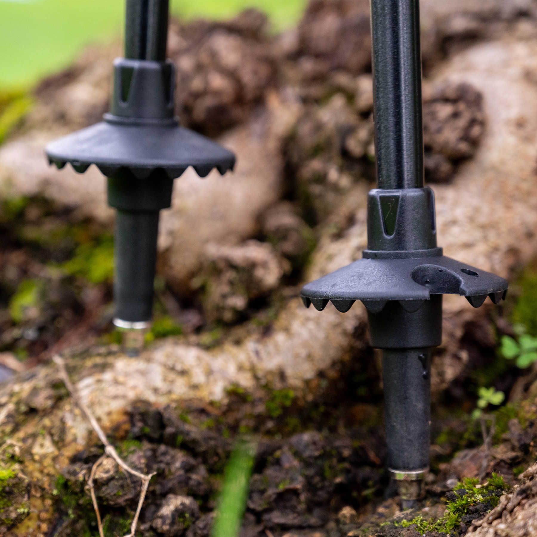 Твердосплавний наконечник гарантує надійне зчеплення з будь-яким типом рельєфу, а знімний гумовий ковпачок дозволяє безпечно використовувати палиці на твердих поверхнях, таких як асфальт або плитка.