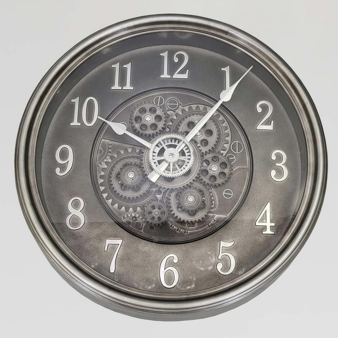Діаметр: 36,3 см Товщина: 7,5 см Вага: 0,970 кг Матеріал: скло, пластик Декоративні шестерні, що самостійно обертаються через додаткові батареї. Механізм: кварцовий Живлення: батарейка АА Гарантія: 12 місяців