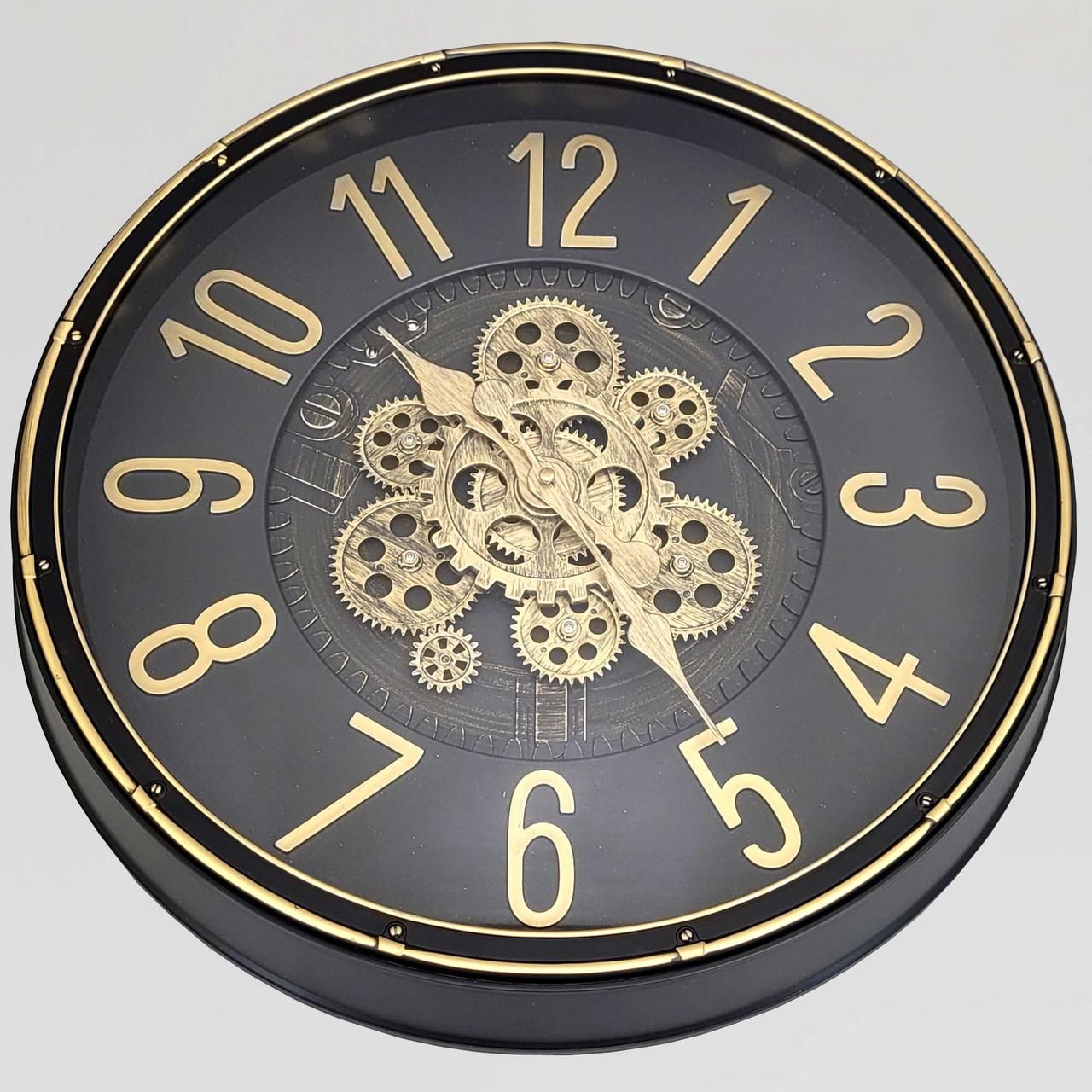 Діаметр: 50,5 см Товщина: 7,2 см Вага: 1,630 кг Матеріал: скло, пластик Декоративні шестерні, що самостійно обертаються через додаткові батареї. Механізм: кварцовий Живлення: батарейка АА Гарантія: 12 місяців