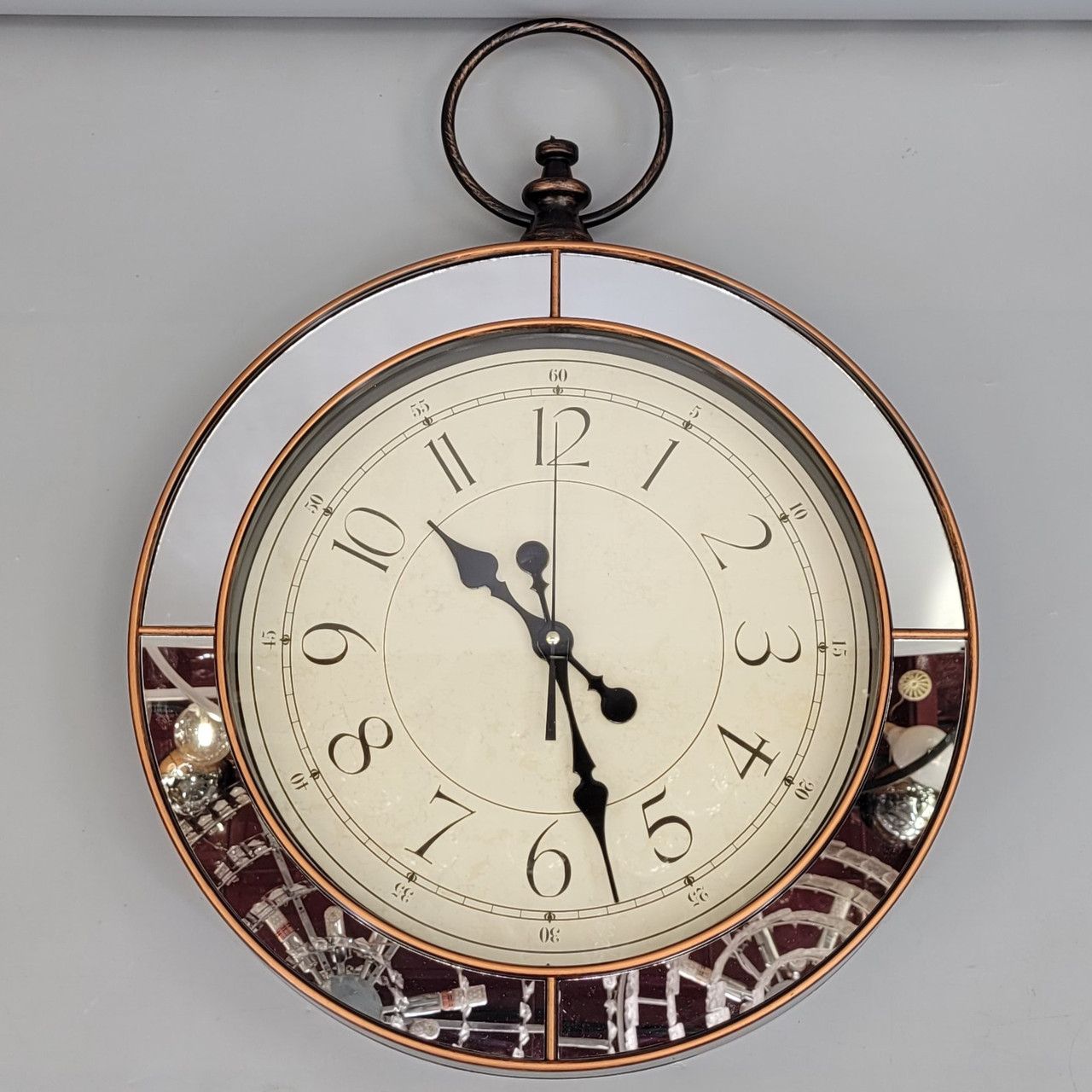 Висота: 58,7 см Ширина: 44 см Товщина: 6см Вага: 1,410 кг Матеріал: скло, пластик, дзеркальні елементи Механізм: кварцовий Живлення: батарейка АА Гарантія: 12 місяців