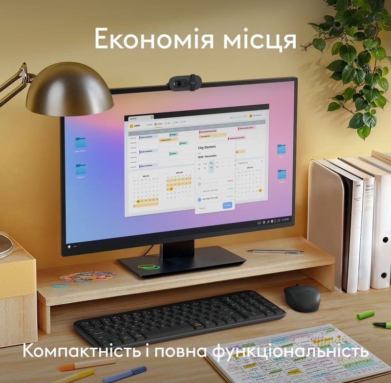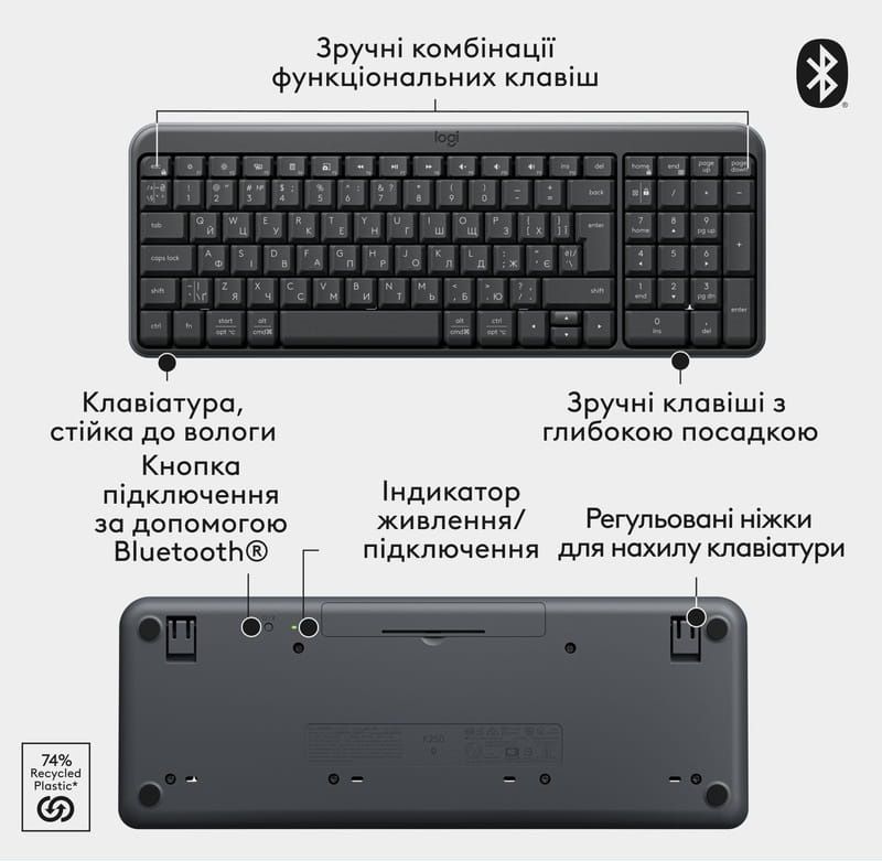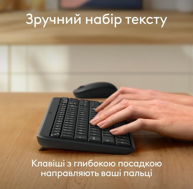 Комплект розроблений з акцентом на комфорт, довговічність та екологічність. Клавіатура має класичну розкладку з цифровим блоком, вологозахищену конструкцію та зручний кут нахилу, а компактна симетрична миша однаково зручна для правшів та шульг.