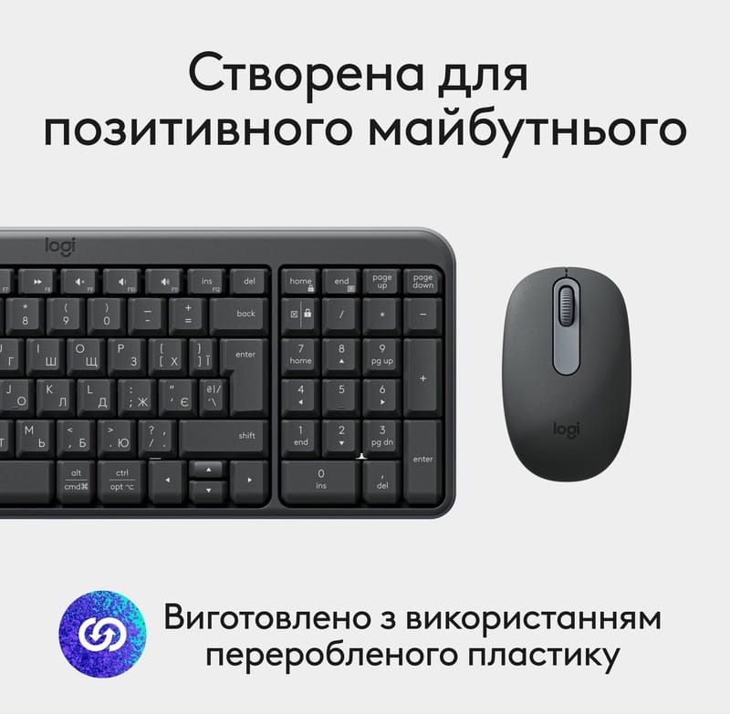 - Корпус виготовлений з використанням переробленого пластику (до 64% у клавіатури та 66% у миші)