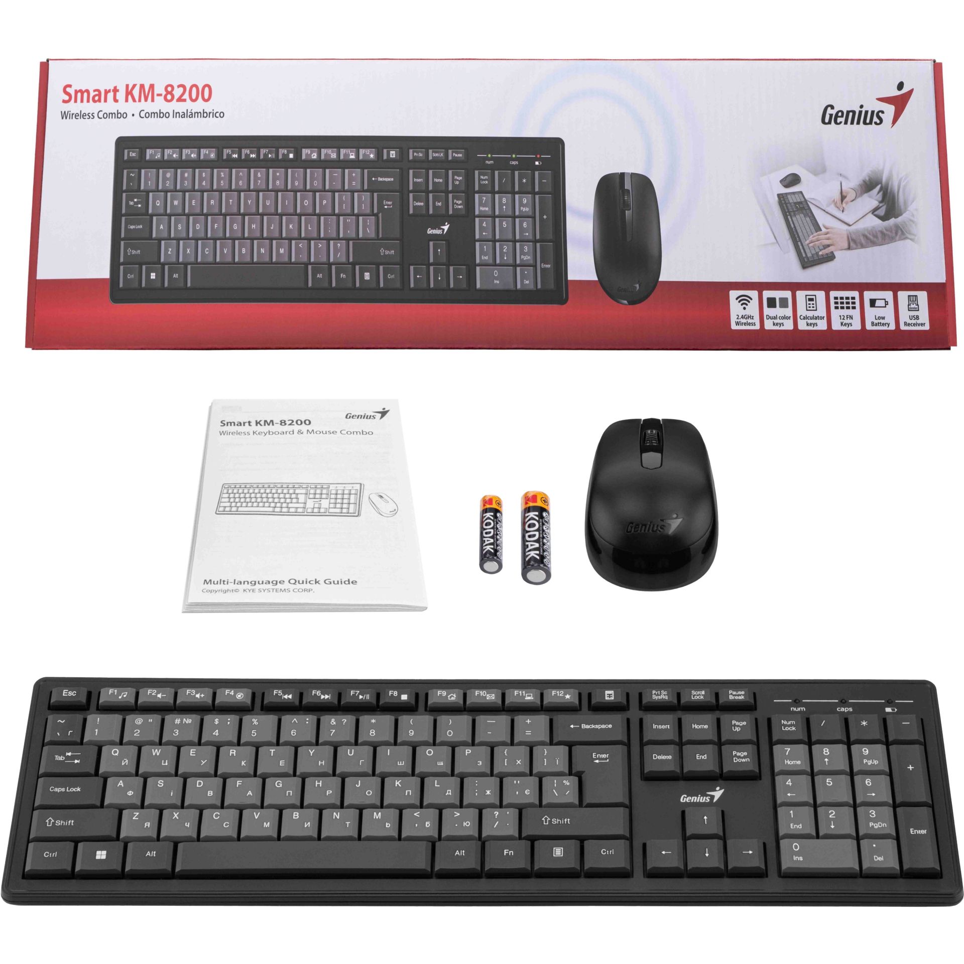 Genius KM-8200 — це практичний бездротовий комплект клавіатури та миші, призначений для комфортної повсякденної роботи за комп'ютером вдома чи в офісі. Пристрій поєднує стабільне бездротове підключення, ергономічну конструкцію та зручну повнорозмірну клавіатуру з підтримкою української та англійської розкладок.