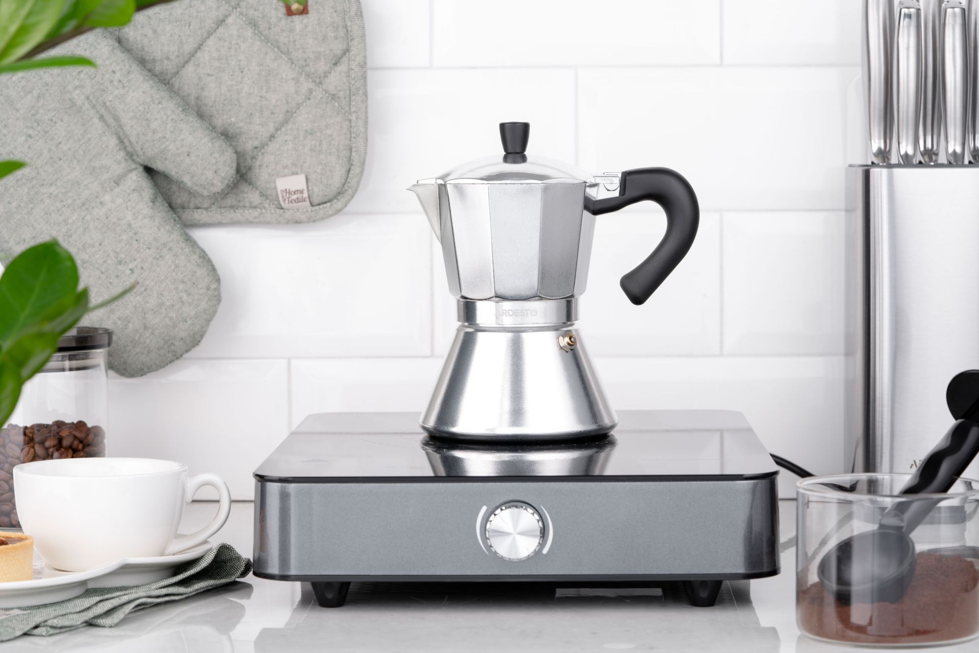 - Сумісність з усіма основними типами плит, включаючи індукційні, робить цю кавоварку універсальним кухонним аксесуаром.