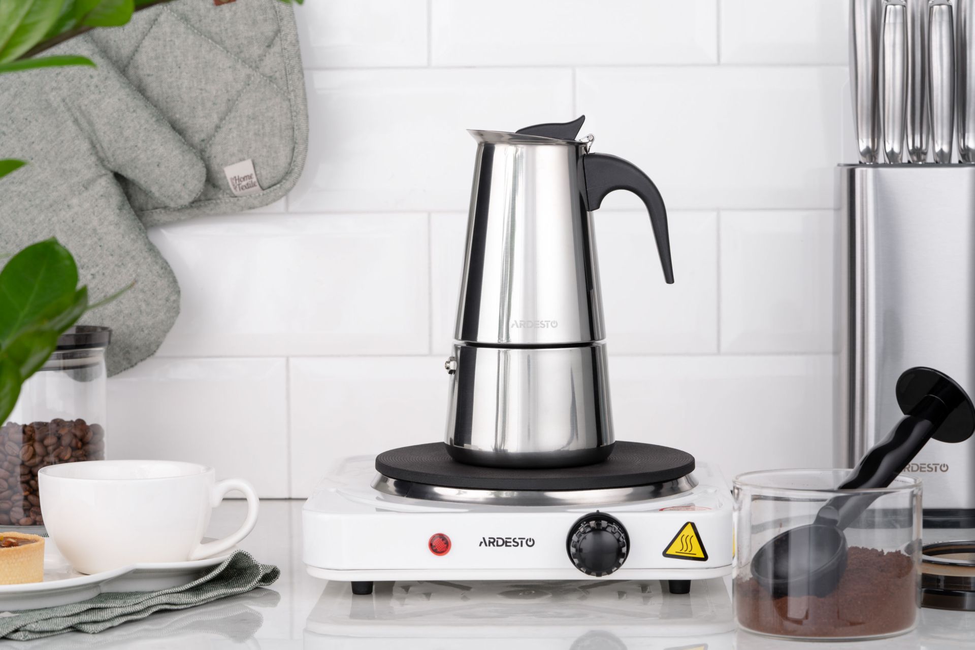- Ця кавоварка сумісна з більшістю типів плит, що робить її практичним рішенням для різних кухонь та умов експлуатації.