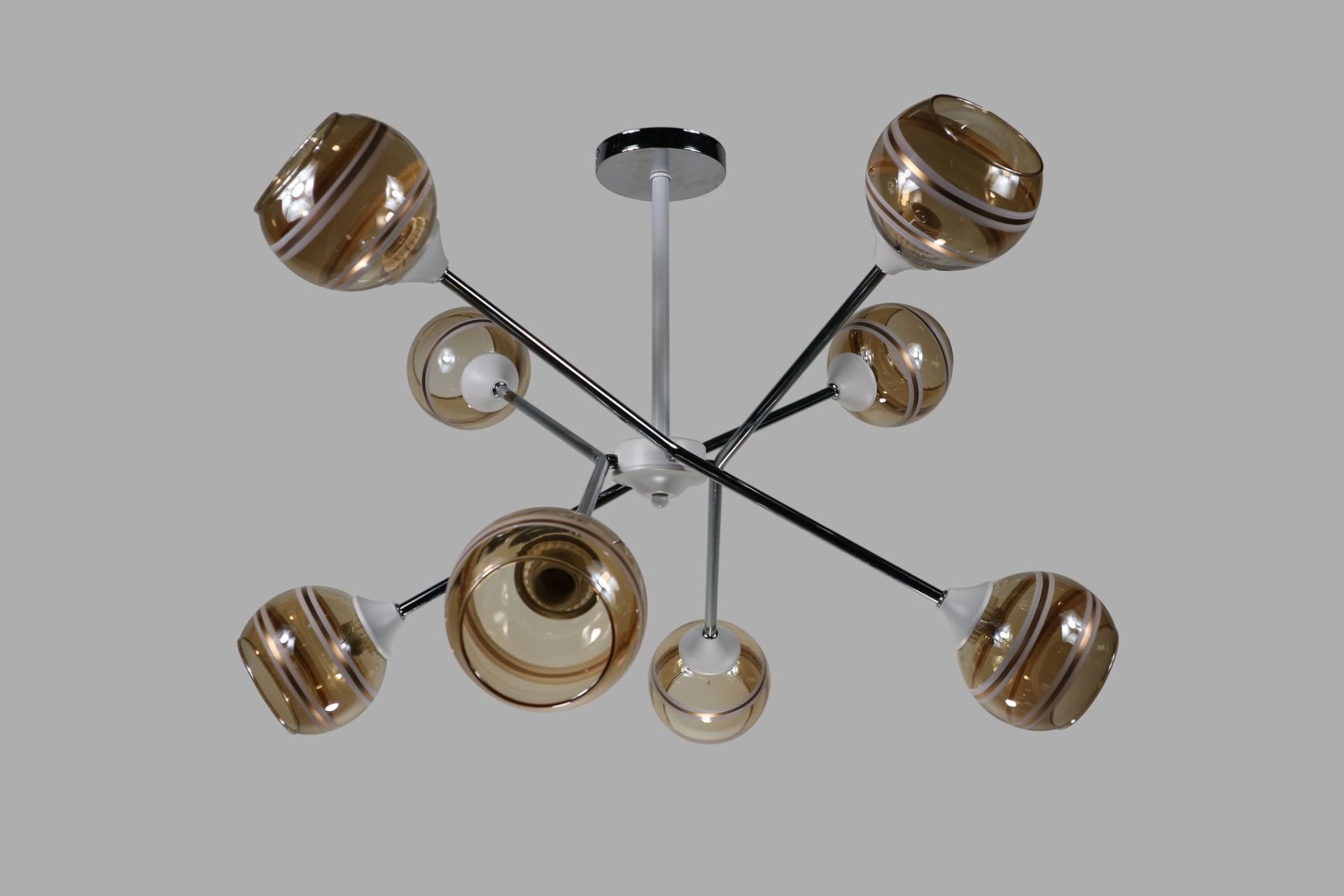 Корпус люстри виконаний у хромованому кольорі, що вдало контрастує з теплим тоном скла та підкреслює сучасний характер моделі. Така комбінація робить люстру універсальною для інтер’єрів.