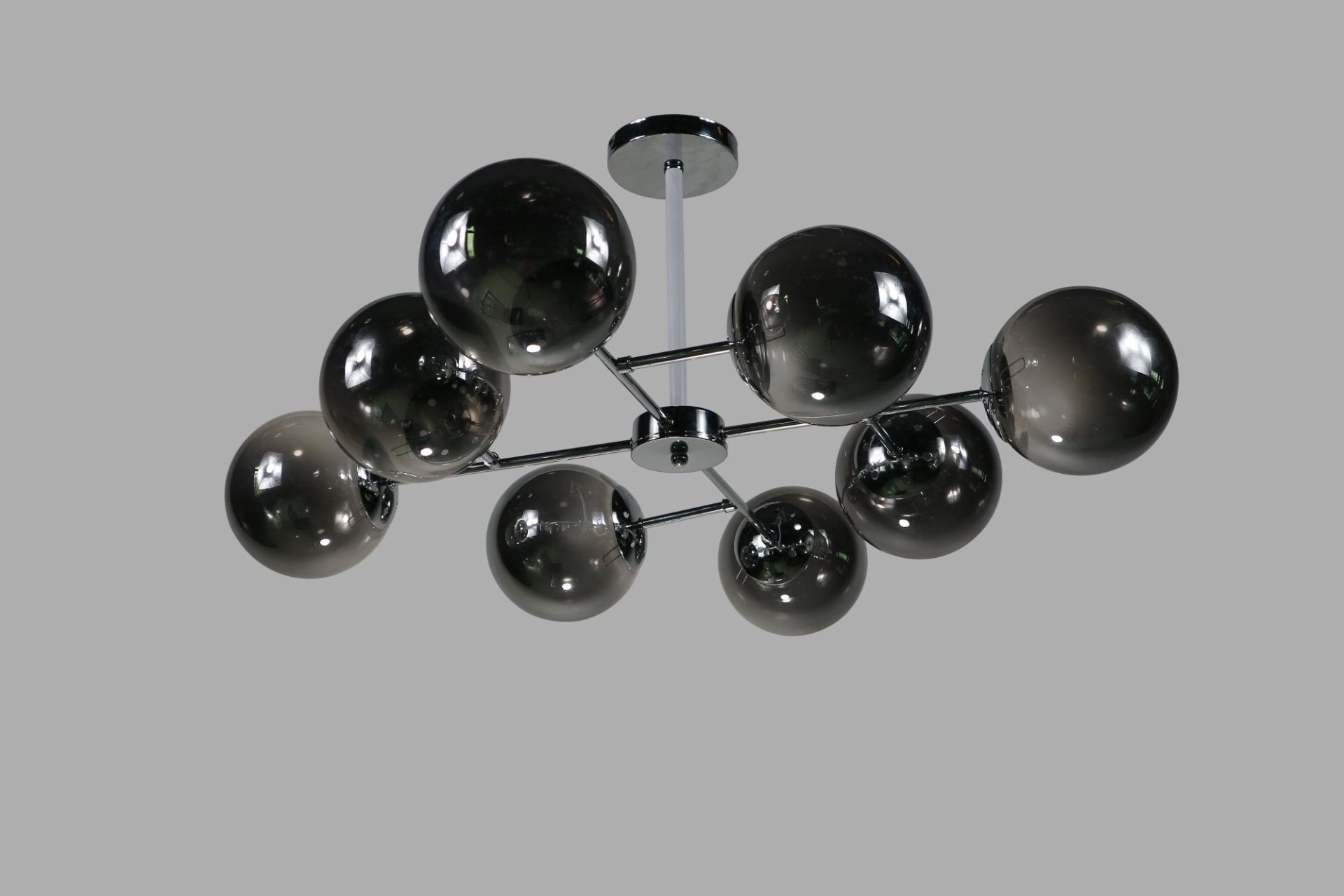 Плафони мають форму кулі та кріпляться на кліпсах, що надає конструкції легкості й сучасного вигляду. Вони виконані з прозорого скла з чорним напиленням, яке створює стильний контраст і додає світлу глибини та виразності. Увімкнене освітлення формує цікаву гру відблисків, а у вимкненому стані люстра виглядає як дизайнерський арт-об’єкт.