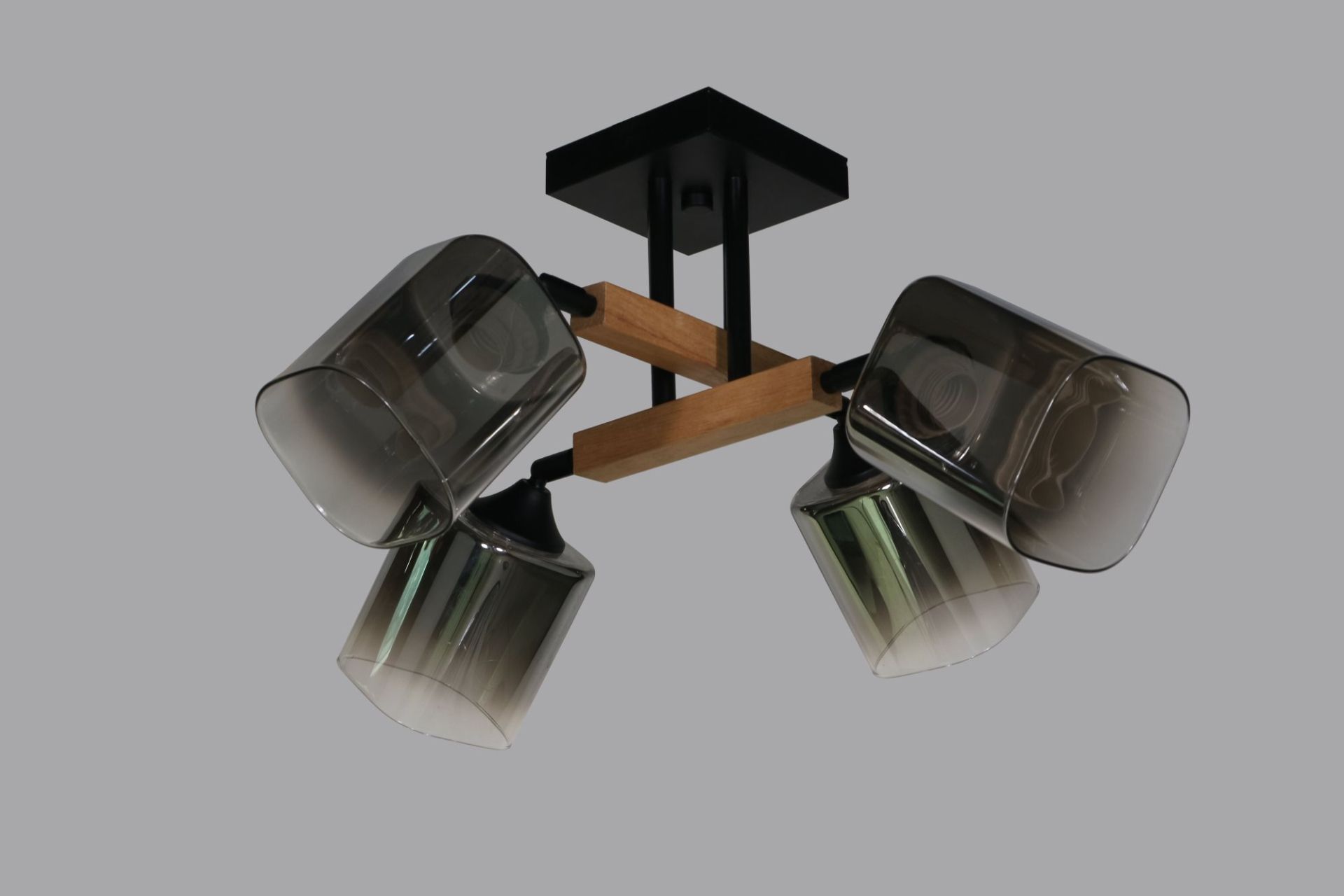 Плафони виготовлені зі скла прозорого типу з плавним переходом у чорний колір, що створює ефект глибини та м’яко фільтрує світло. Такий градієнт виглядає сучасно й додає люстрі візуальної виразності, формуючи затишну атмосферу у приміщенні.