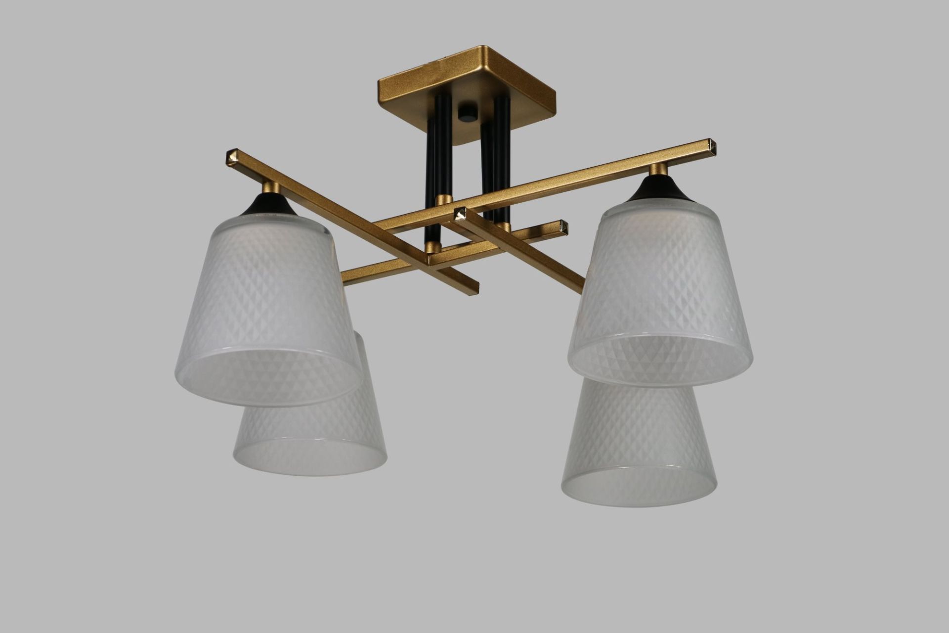 Плафони виконані зі скла прозоро-матового кольору у формі піраміди, завдяки чому світло м’яко розсіюється та створює приємну, ненав’язливу атмосферу. Геометрична форма додає люстрі сучасного характеру та робить її стильним декоративним акцентом.