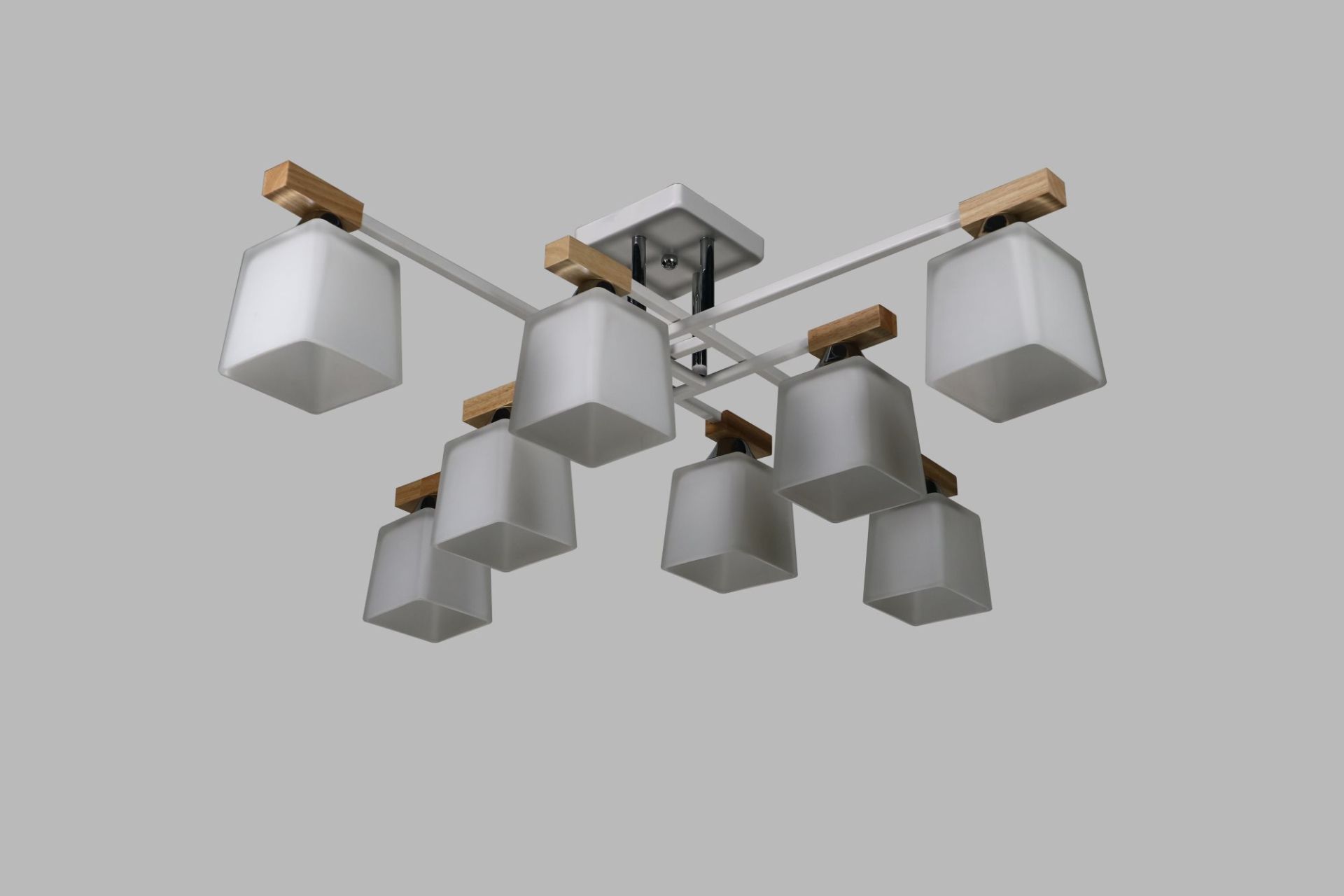 Плафони виконані у білому кольорі та мають квадратну форму, завдяки чому світло м’яко розсіюється й створює комфортну, затишну атмосферу. Чітка геометрія плафонів додає люстрі сучасного вигляду та робить її візуально акуратною, незважаючи на кількість джерел світла.