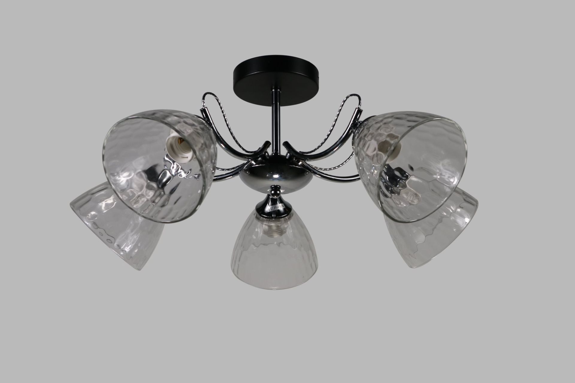 Плафони виконані з прозорого скла з рельєфною поверхнею, яка красиво заломлює світло та створює м’яку гру відблисків. Завдяки такому оформленню освітлення виглядає більш глибоким і декоративним, не втрачаючи функціональності.