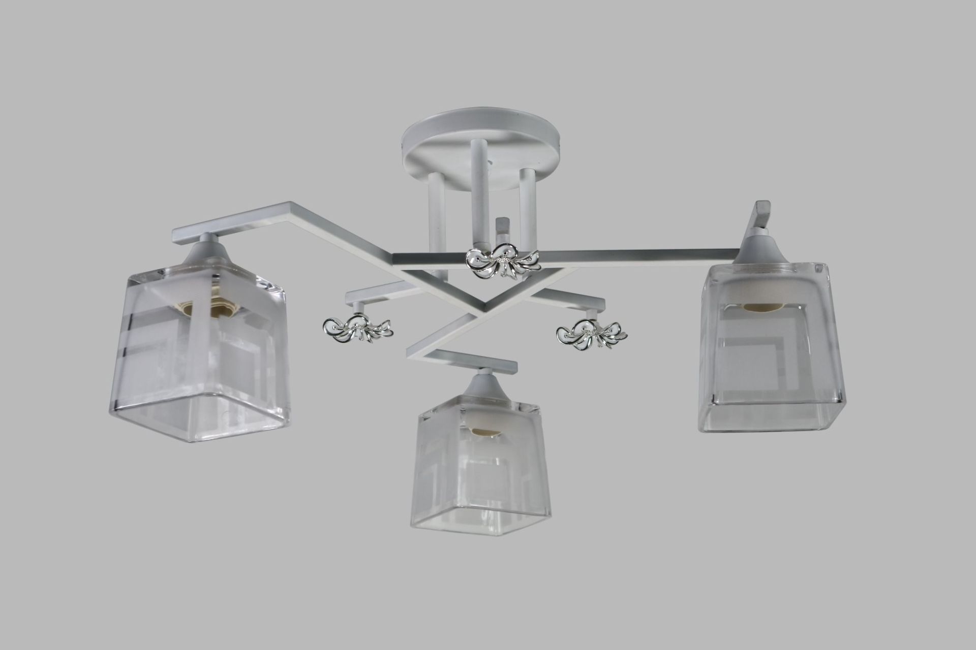 Плафони виконані з прозорого скла з білим орнаментом, який м’яко фільтрує світло та створює витончений декоративний ефект. Завдяки такому оформленню освітлення виглядає легким і приємним для очей.