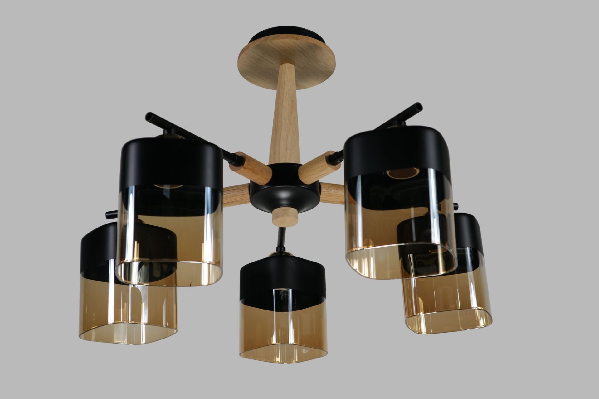 Люстра декоративна IS 96466/5 BK — сучасна модель з виразним дизайном, у якій поєднуються геометричні форми, теплі відтінки скла та натуральні декоративні акценти. Світильник оснащений п'ятьма плафонами під стандартний цоколь E27, що забезпечує рівномірне та комфортне освітлення приміщення.