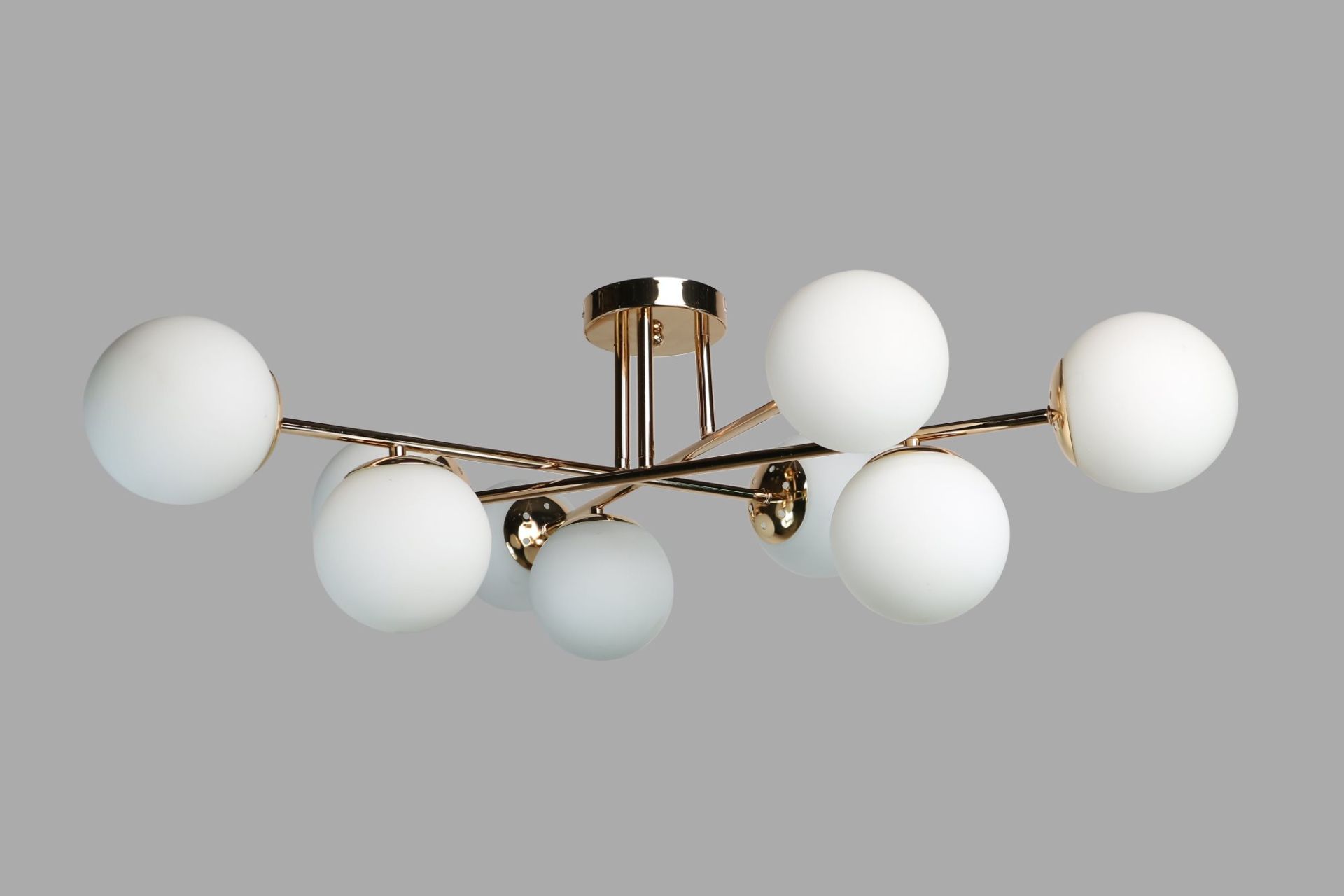 Плафони виконані у формі кулі білого кольору, що м’яко розсіює світло та створює затишну, комфортну атмосферу. Така форма надає люстрі легкості та декоративності, гармонійно поєднуючись із великими інтер’єрами.