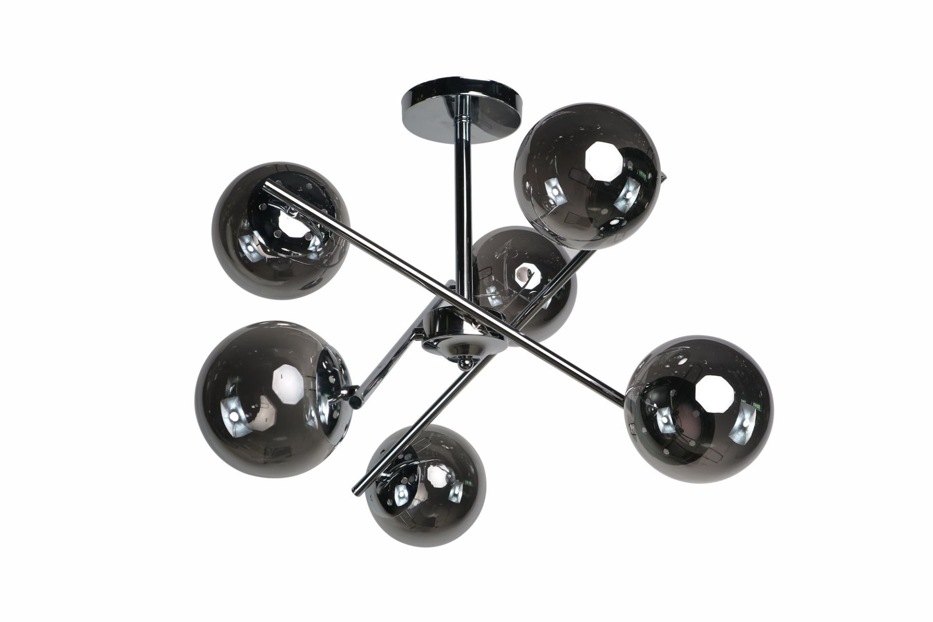 Каркас люстри виготовлений у хромовому кольорі, що підкреслює сучасний характер моделі та забезпечує контраст із темними плафонами. Комбінація чорного скла та хромованого металу робить дизайн стриманим, але вражаючим.