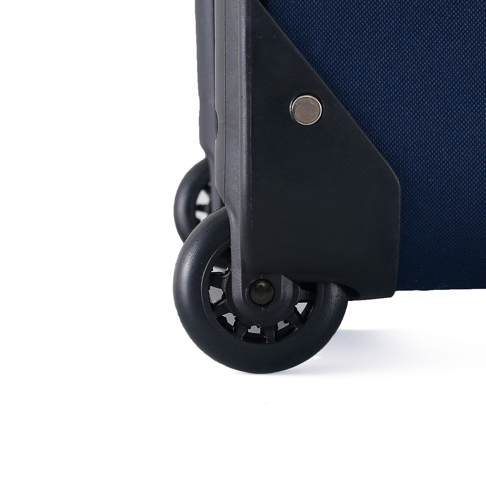 - Приховані колеса великого діаметру - дана модель обладнана двома колесами, що з обох боків захищені пластиковими бортами. Поліуретанові колеса мають достатньо великий діаметр, що забезпечує більш плавне кочення навіть по нерівним поверхням. Валізи з парою прихованих коліс більш захищені від поламок внаслідок ударів.