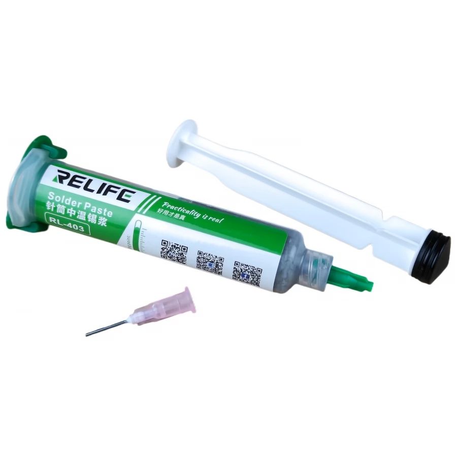 Relife RL-403 — це професійна паяльна паста з флюсом для точкового паяння електронних компонентів та реболінгу BGA-мікросхем. Виготовлена на основі класичного олова-свинцю (сплав Sn63/Pb37) із температурою плавлення 183 °C. Продукт поставляється у зручному шприці з об'ємом 10 мл, що забезпечує зручне, чисте та точне нанесення матеріалу на контактні майданчики перед паянням. Ця паста призначена для ремонту та монтажу електронних плат, включаючи мобільні пристрої, ПК-обладнання, контролери та інші SMT/BGA-схеми.