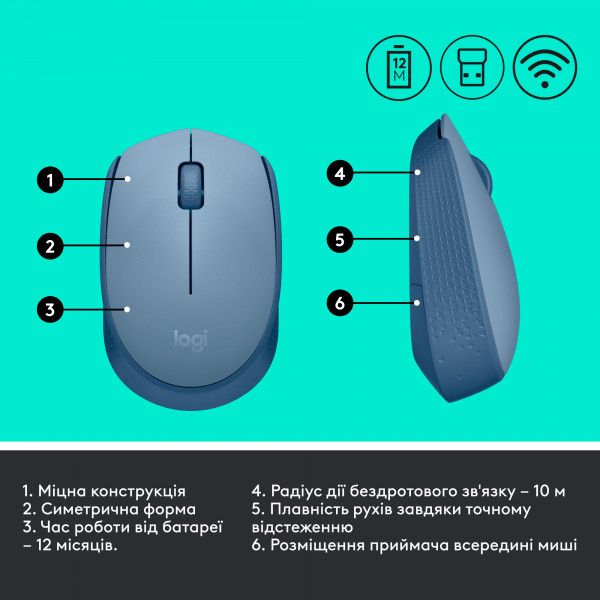 Logitech M171 – це компактна та надійна бездротова миша з простим підключенням та універсальним дизайном, що підходить як для правшів, так і для шульг. Легка, зручна та точна, вона стане чудовим рішенням для роботи вдома, в офісі або в дорозі.