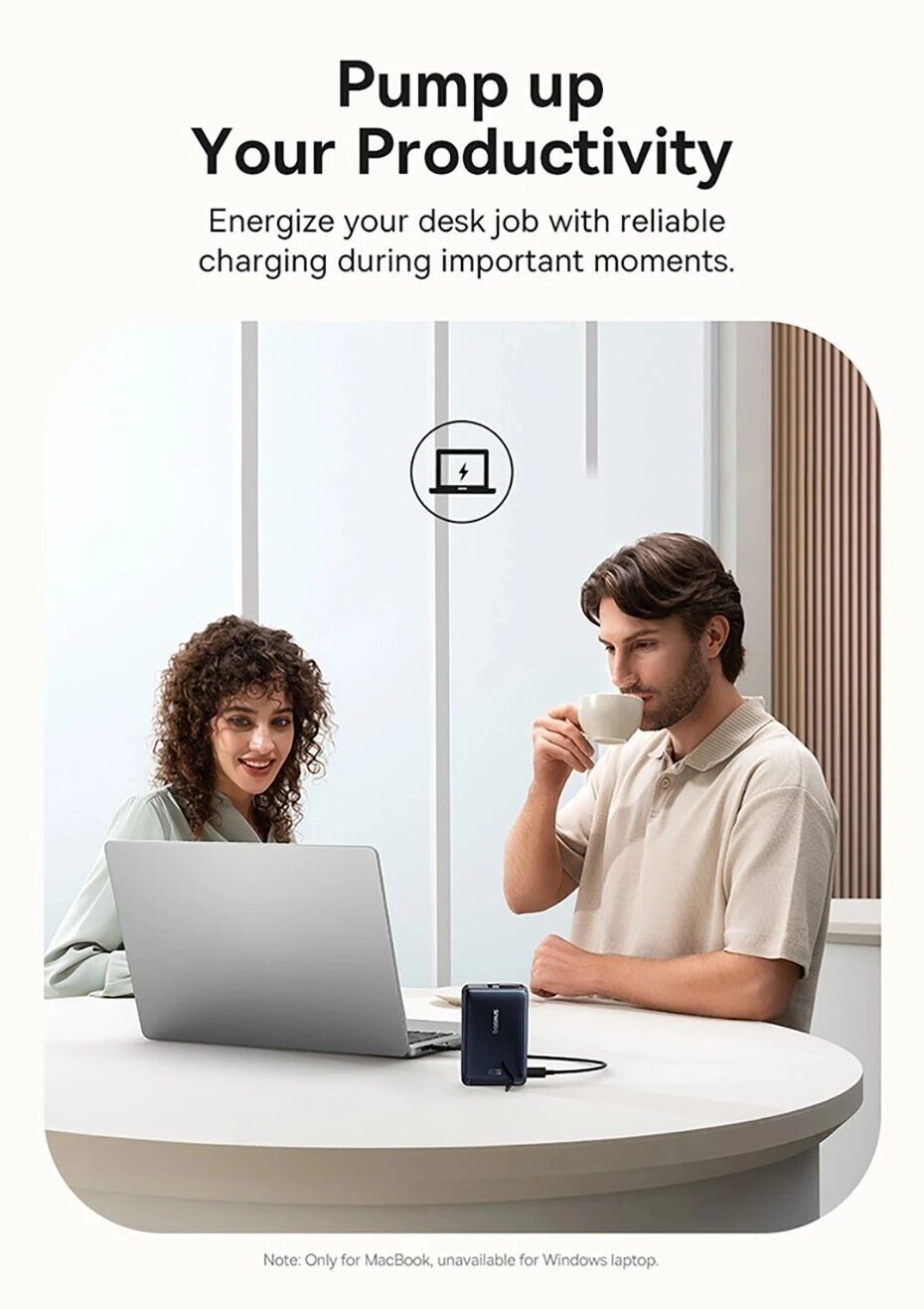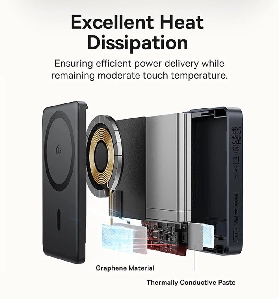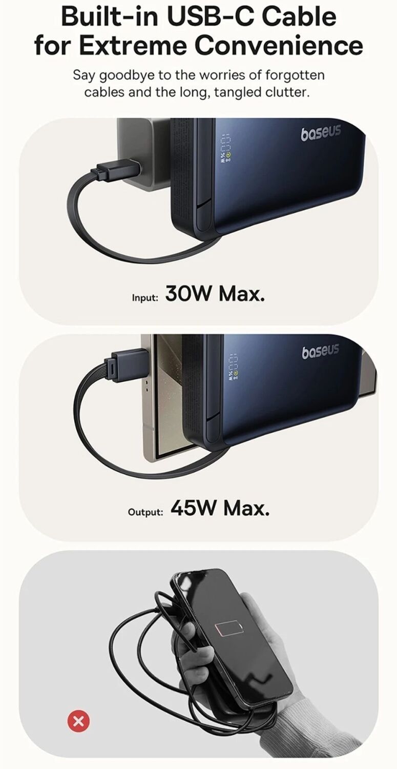 Цей повербанк оснащений бездротовою магнітною зарядкою з підтримкою MagSafe, вбудованим кабелем з роз'ємом Type-C і повноцінним портом Type-C, що дозволяє одночасно заряджати до трьох пристроїв. Завдяки потужності до 45 Вт він підходить не тільки для смартфонів, але і для більш енергоємних пристроїв, включаючи планшети та сучасні аксесуари.