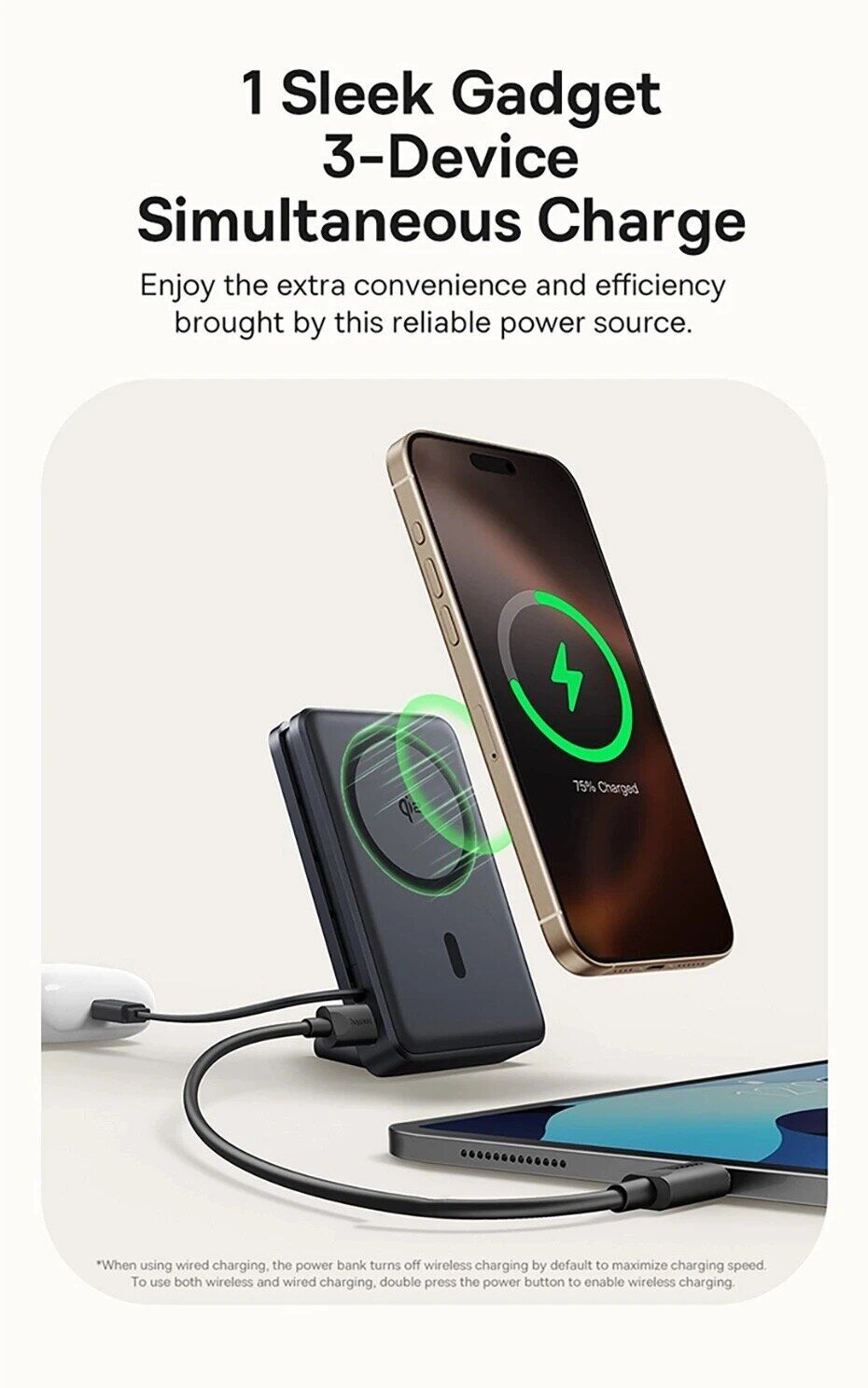 - Цей пристрій поєднує потужний зовнішній акумулятор, бездротову зарядку Qi2 і складну підставку. Це дозволяє заряджати смартфон як у горизонтальному, так і вертикальному положенні, зручно переглядаючи відео або працюючи з повідомленнями.