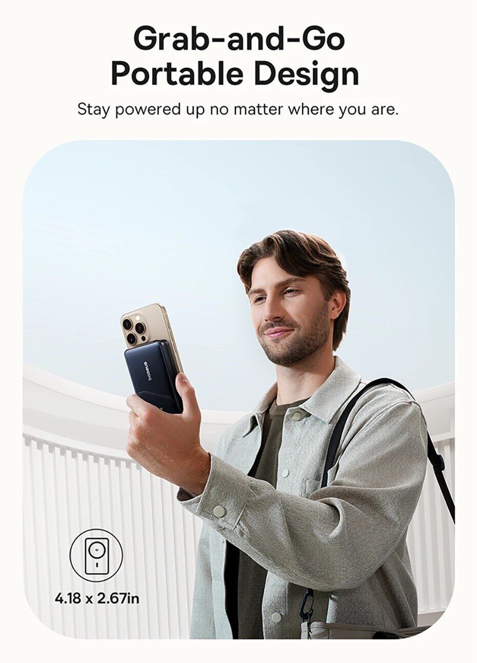 - Вбудоване магнітне кільце забезпечує точне позиціонування смартфона та стабільну подачу енергії без втрат. Цей повербанк повністю сумісний з iPhone 12–17 серій та аксесуарами MagSafe, включаючи AirPods із підтримкою бездротової зарядки.