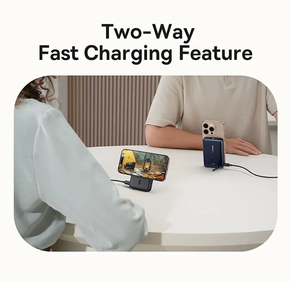 - Вбудована підставка перетворює повербанк на зручну док-станцію для смартфона, що особливо зручно на робочому столі або в подорожі.