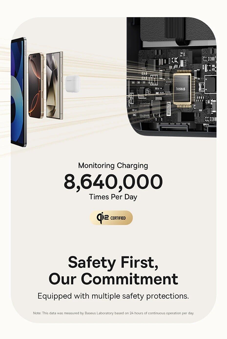 - Пристрій оснащений 10 рівнями інтелектуального захисту від перегріву, перевантаження, перенапруги, короткого замикання та перезаряджання, забезпечуючи безпеку як повербанка, так і підключених пристроїв.