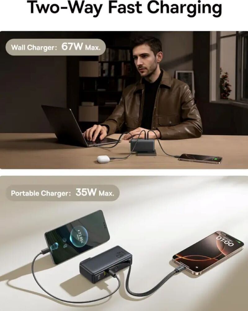 - Потужність до 67 Вт при роботі від мережі та до 35 Вт у портативному режимі забезпечує швидку зарядку як смартфонів, так і більш енергоємних пристроїв, суттєво заощаджуючи час.