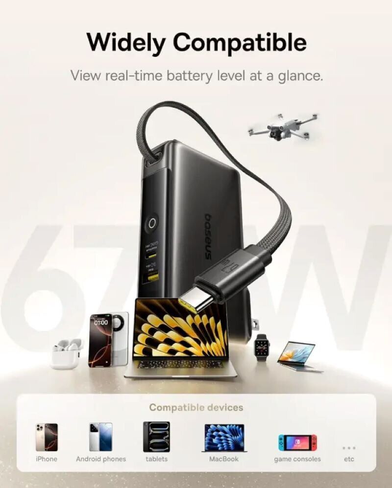 Пристрій може працювати як від вбудованого акумулятора, так і безпосередньо від мережі 220V, забезпечуючи швидку та стабільну подачу енергії для смартфонів, планшетів, навушників та іншої електроніки. Завдяки високій потужності до 67 Вт та продуманій конструкції Baseus Nomos NT11 здатний замінити відразу кілька зарядних пристроїв.